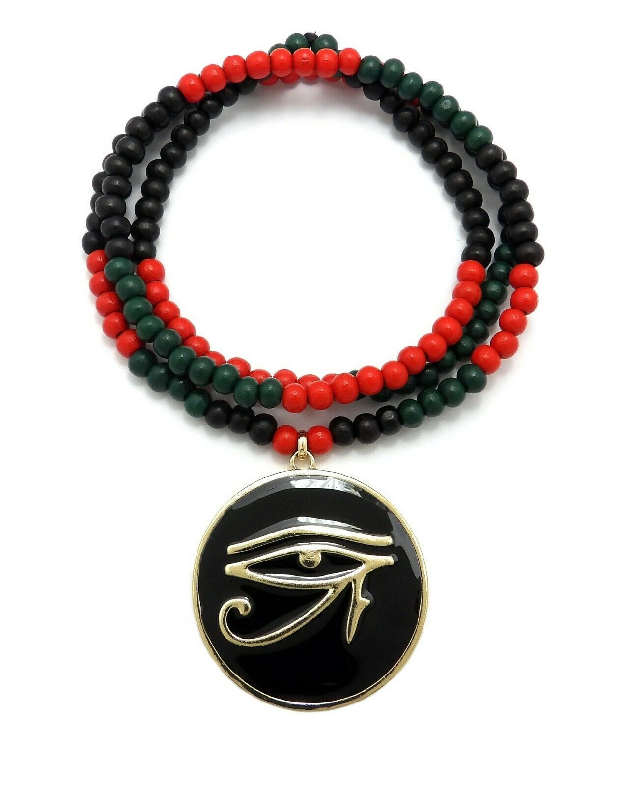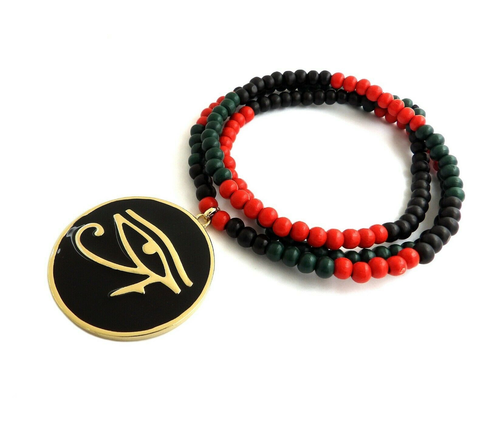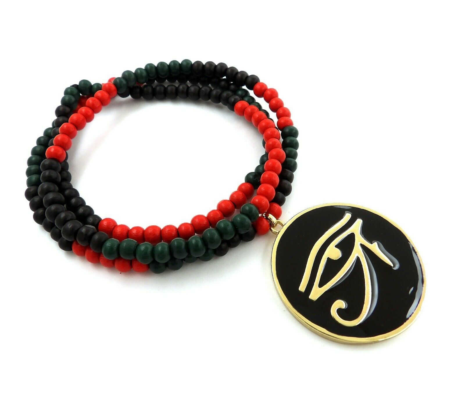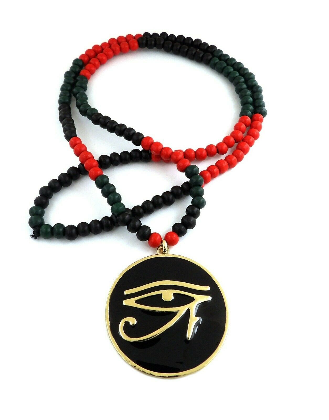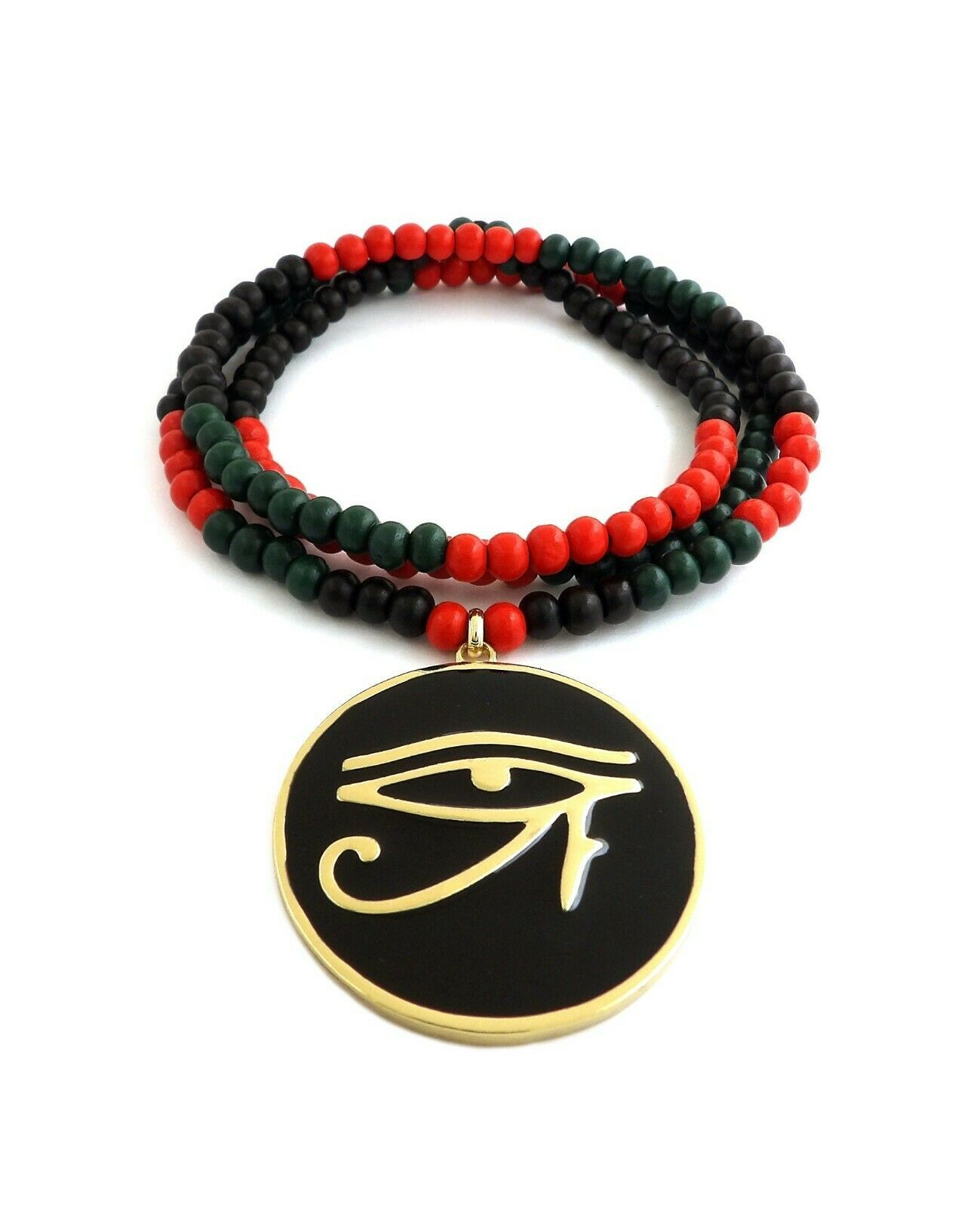 - Gold Egyptian Eye of Horus Medallion Pendant Necklace, 6mm 30" Wooden Chain