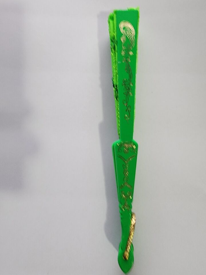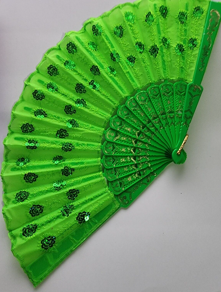 You are Buying a Brand New And Factory Sealed Gold Green Large Lace Floral Folding Hand Held Plastic Chinese Fan.... Length 9 inches; Opened Width 16.5 inches, party, home decoration, wall decoration, festival season, school play, tea party, Halloween costume, dancing, wedding, prom, pageant, cosplay or any other special occasion. These floral folding hand fans are made of fabric with luxury printed vintage flowers, lace around edge, metal U ring, and hollow carved plastic staves.