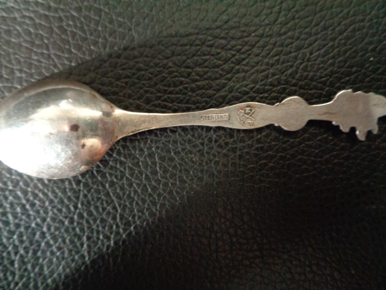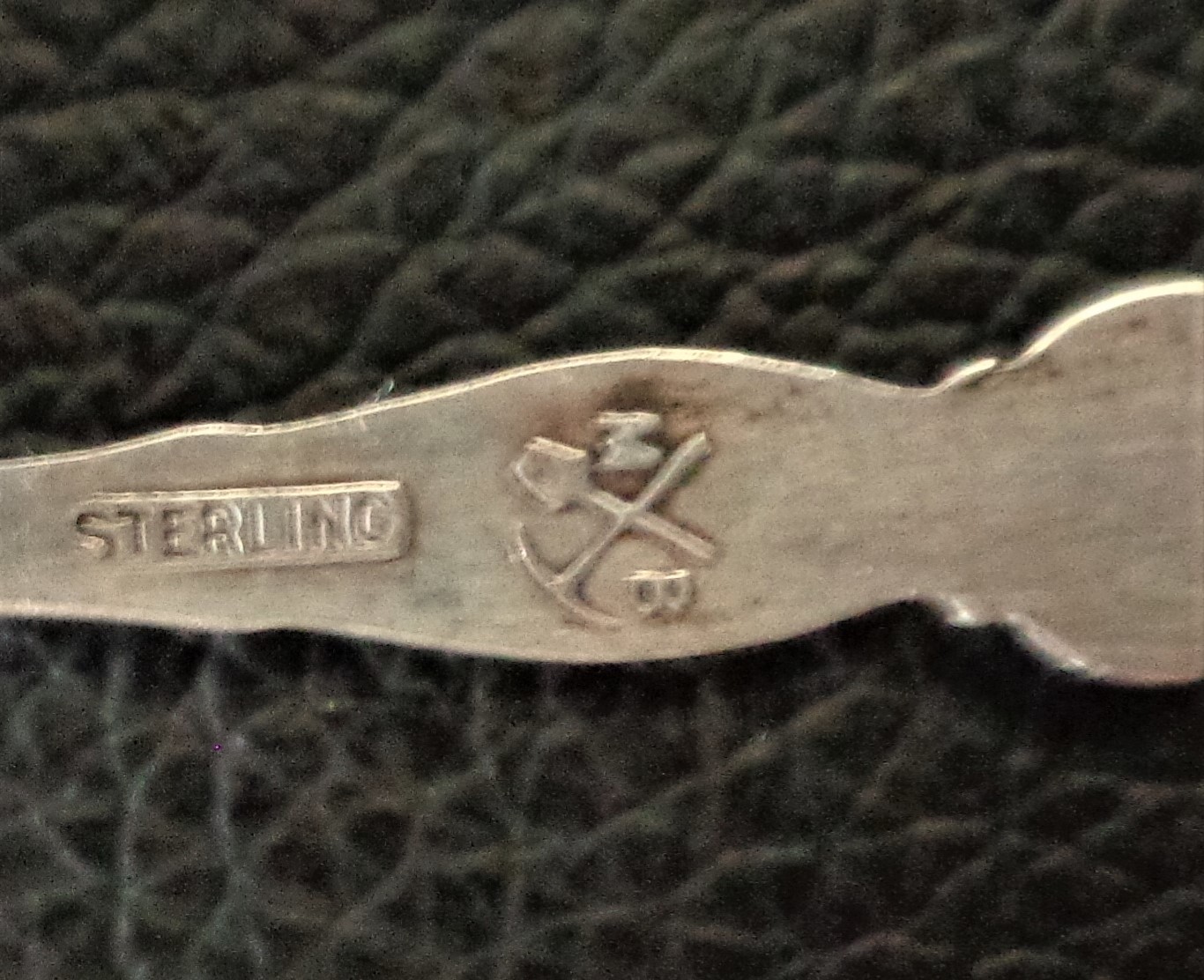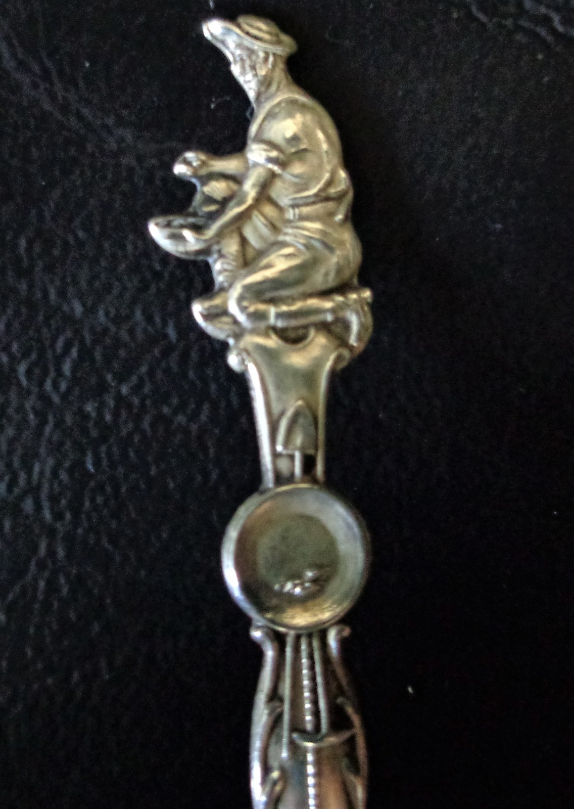 Commemorating the rough and tumble gold-panning Era, or the "Gold Rush" in the late 1800's, this Sterling Silver spoon features a Gold panning fellow in the process of searching out his fortunes. The spoon's stem depicts a Shovel behind a gold pan with a bucket hanging below. All the tools of the trade, so to speak. On the stem's backside we have Sterling stamped in along with a very cool maker's mark which is a Shovel and a Pickaxe crossed with a capital M on the left and a capital B on the right. A good internet detective would likely be able to trace down it's meaning origins.