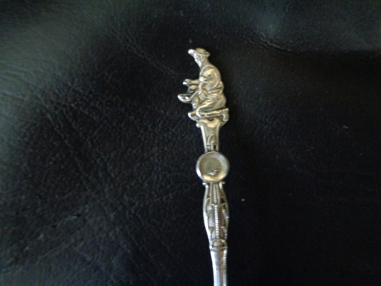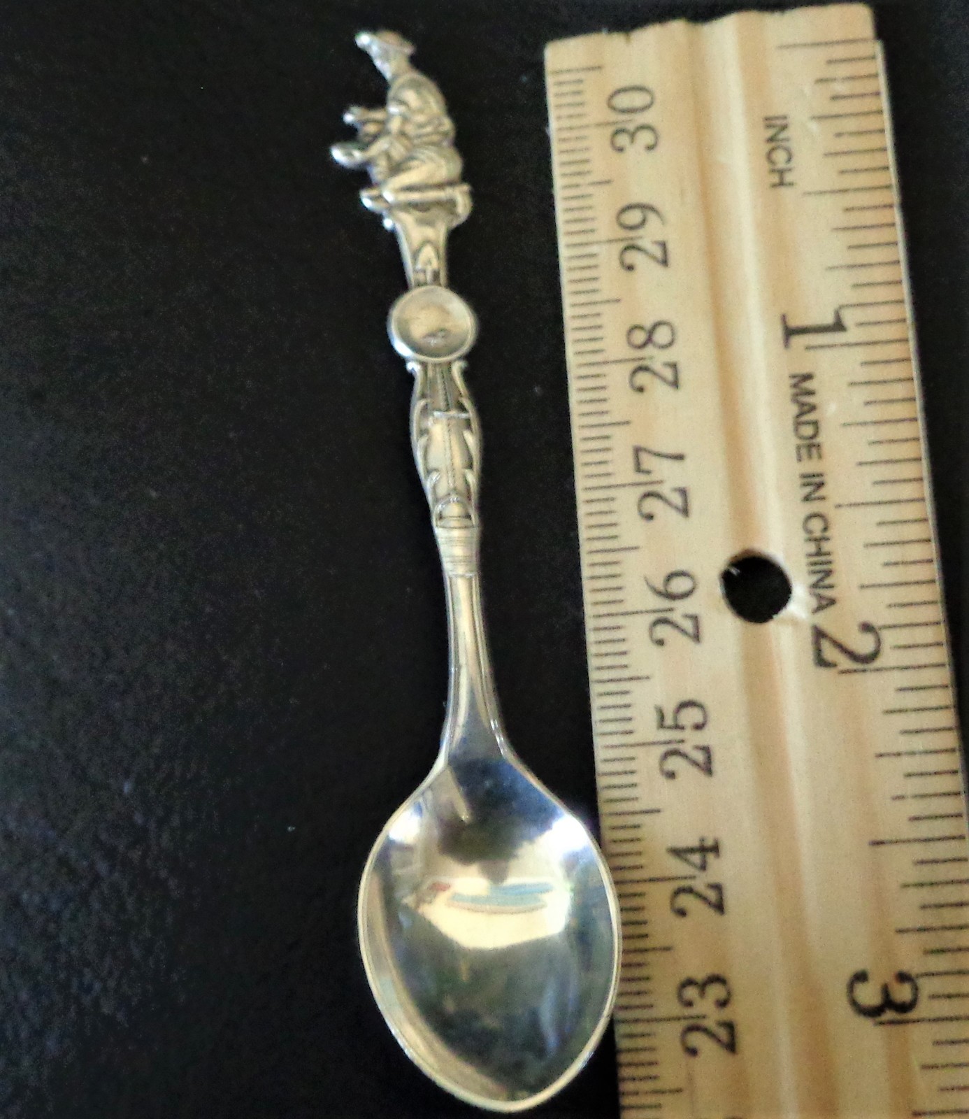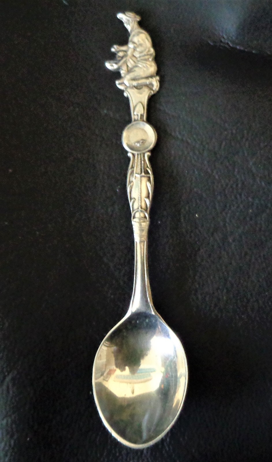 Commemorating the rough and tumble gold-panning Era, or the "Gold Rush" in the late 1800's, this Sterling Silver spoon features a Gold panning fellow in the process of searching out his fortunes. The spoon's stem depicts a Shovel behind a gold pan with a bucket hanging below. All the tools of the trade, so to speak. On the stem's backside we have Sterling stamped in along with a very cool maker's mark which is a Shovel and a Pickaxe crossed with a capital M on the left and a capital B on the right. A good internet detective would likely be able to trace down it's meaning origins.