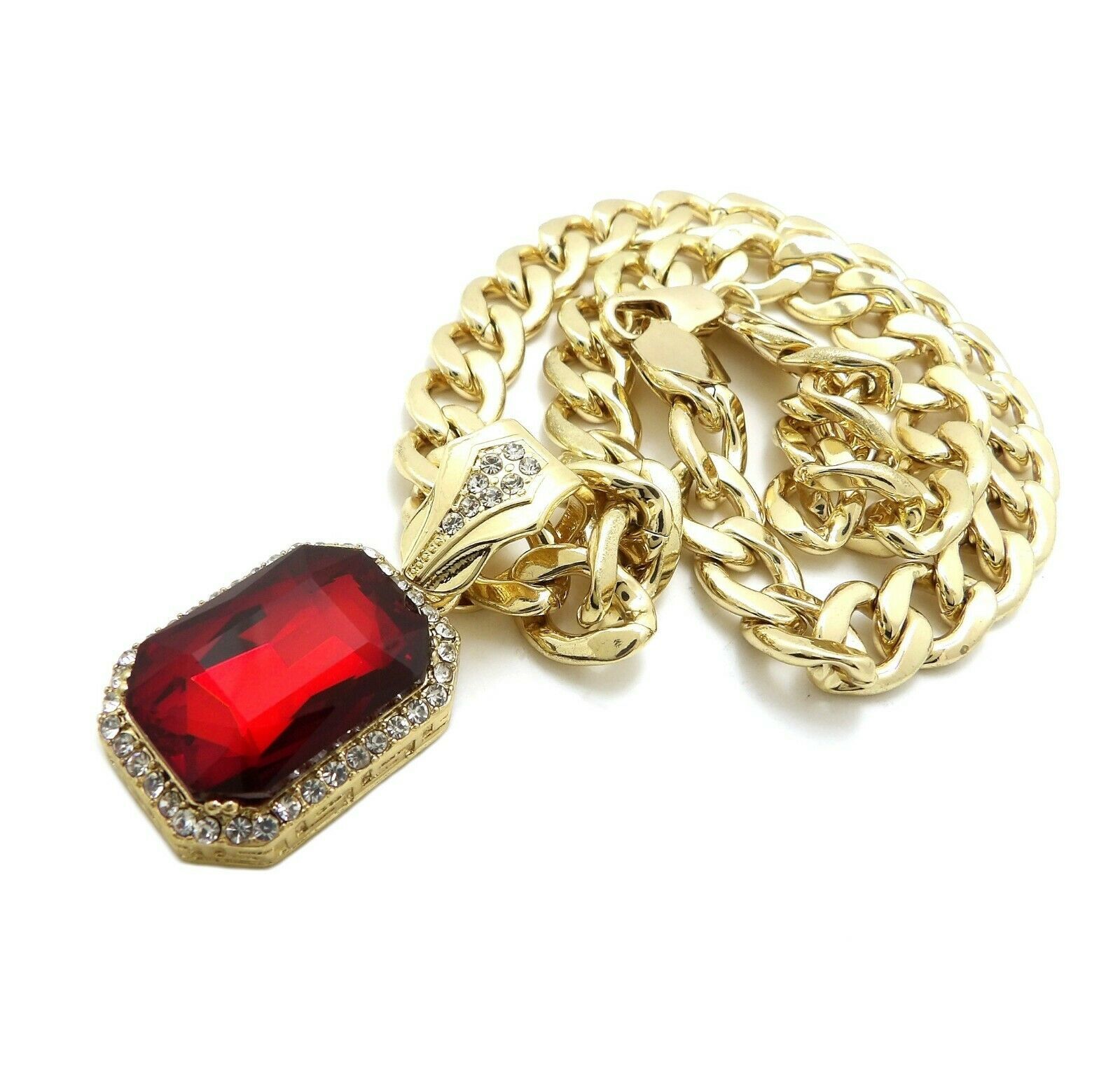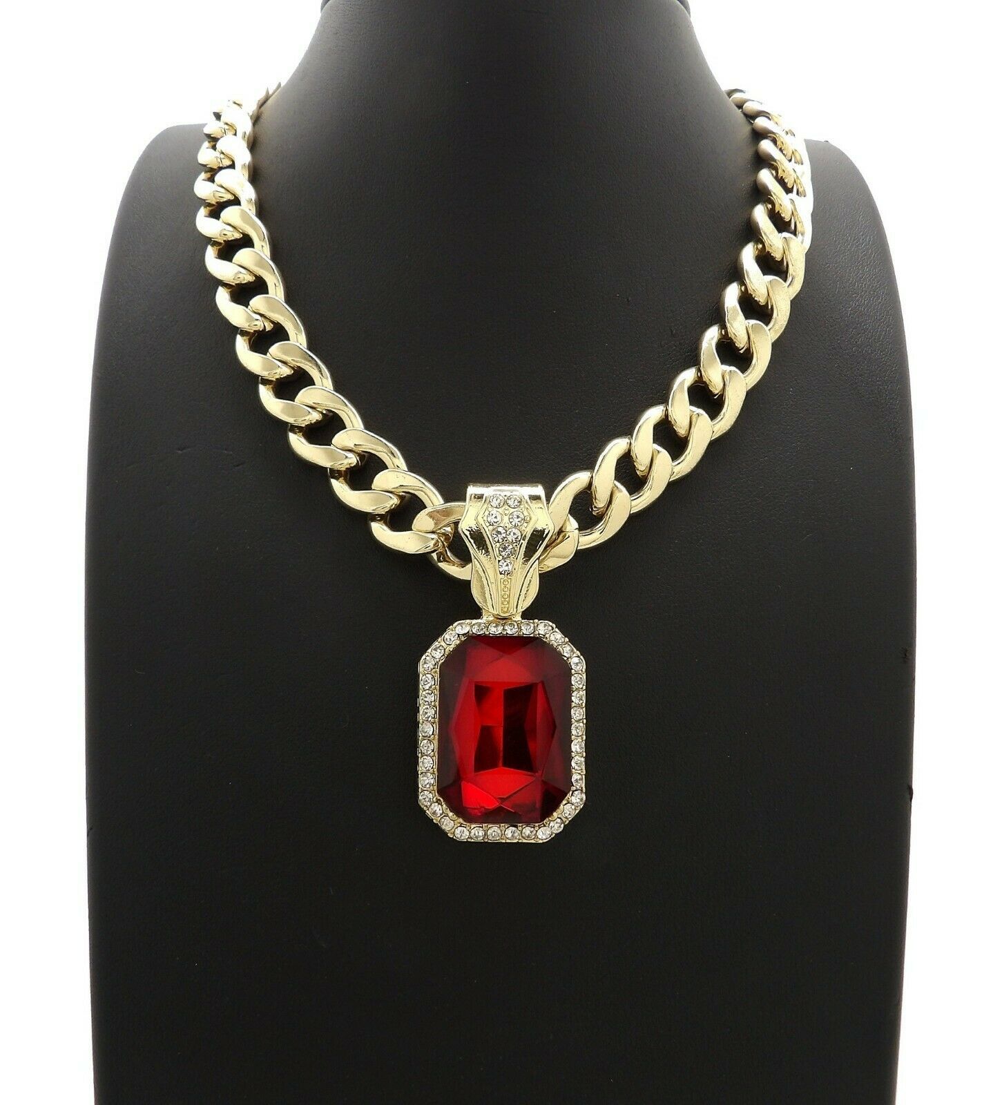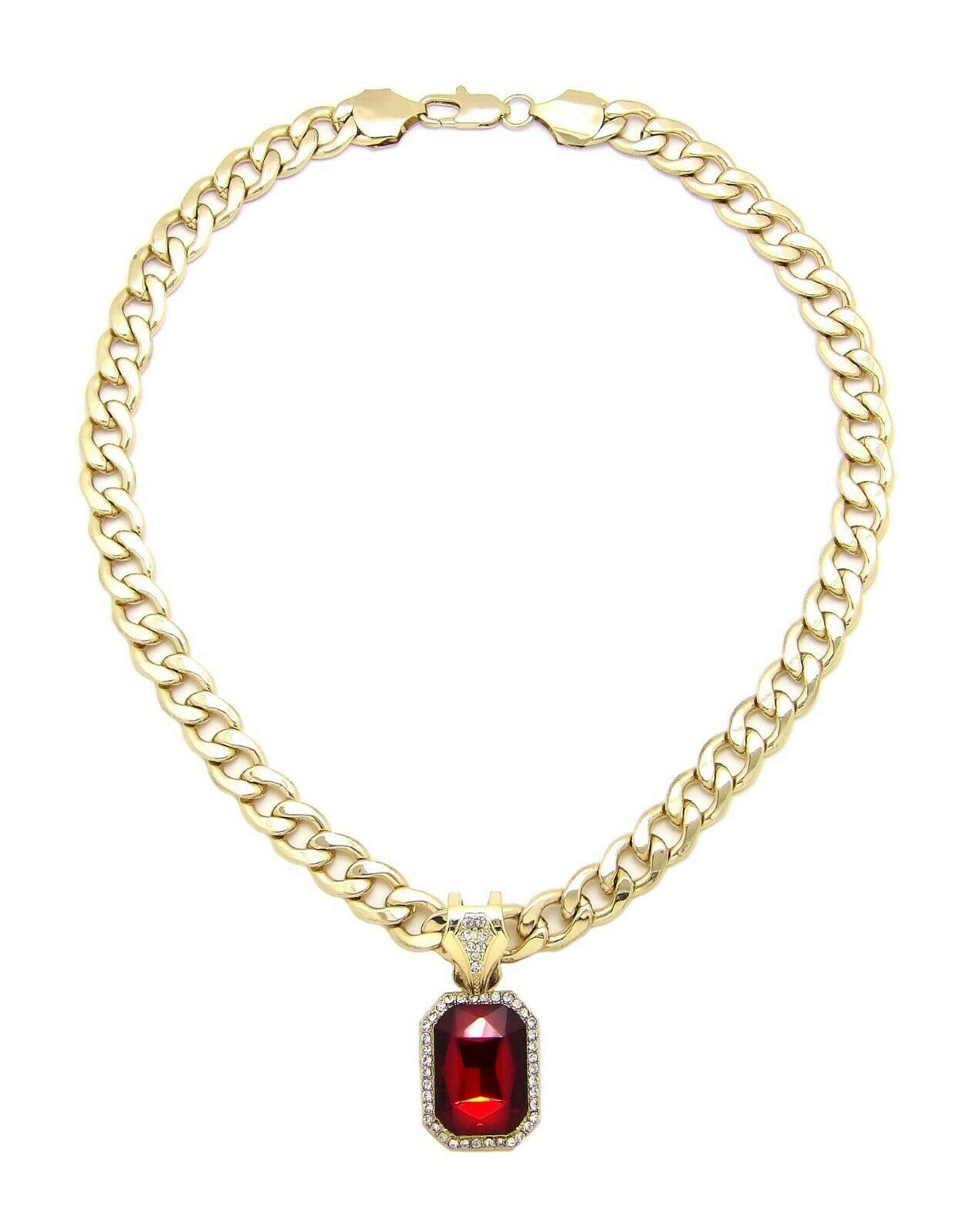 - Gold-Plated Hip Hop Colorful Red Gemstone Pendant Necklace, 9mm 18" Cuban Chain