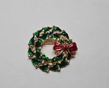 - Gold Tone Christmas Wreath Pin/Brooch, Green Red Bow, 1.75'' Diameter, Vintage