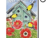 Goldfinch Gathering Garden Flag measures 12" x 18" by Carson. "Welcome" reads correctly on BOTH sides. A lovely decorative summer garden flag features three goldfinches perched on a charming rustic birdhouse.It's a bright sight of gold finches around a rustic birdhouse with colorful red poppies and a "Welcome" caption. Design shows one or more of the following:Backyard Birds, Goldfinches, Birdhouses, Flowers Garden, Poppies, Welcome. This summer yard flag is the perfect accent to add to your outdoor garden decor. Vibrant colors and detailed design that will complement any landscape. Pretty background with exceptional and unique design.Garden Flag Stand Not Included - (Sold separately)