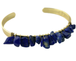 This cuff bracelet has yellow gold plating and unpolished iolite stones attached with wire
