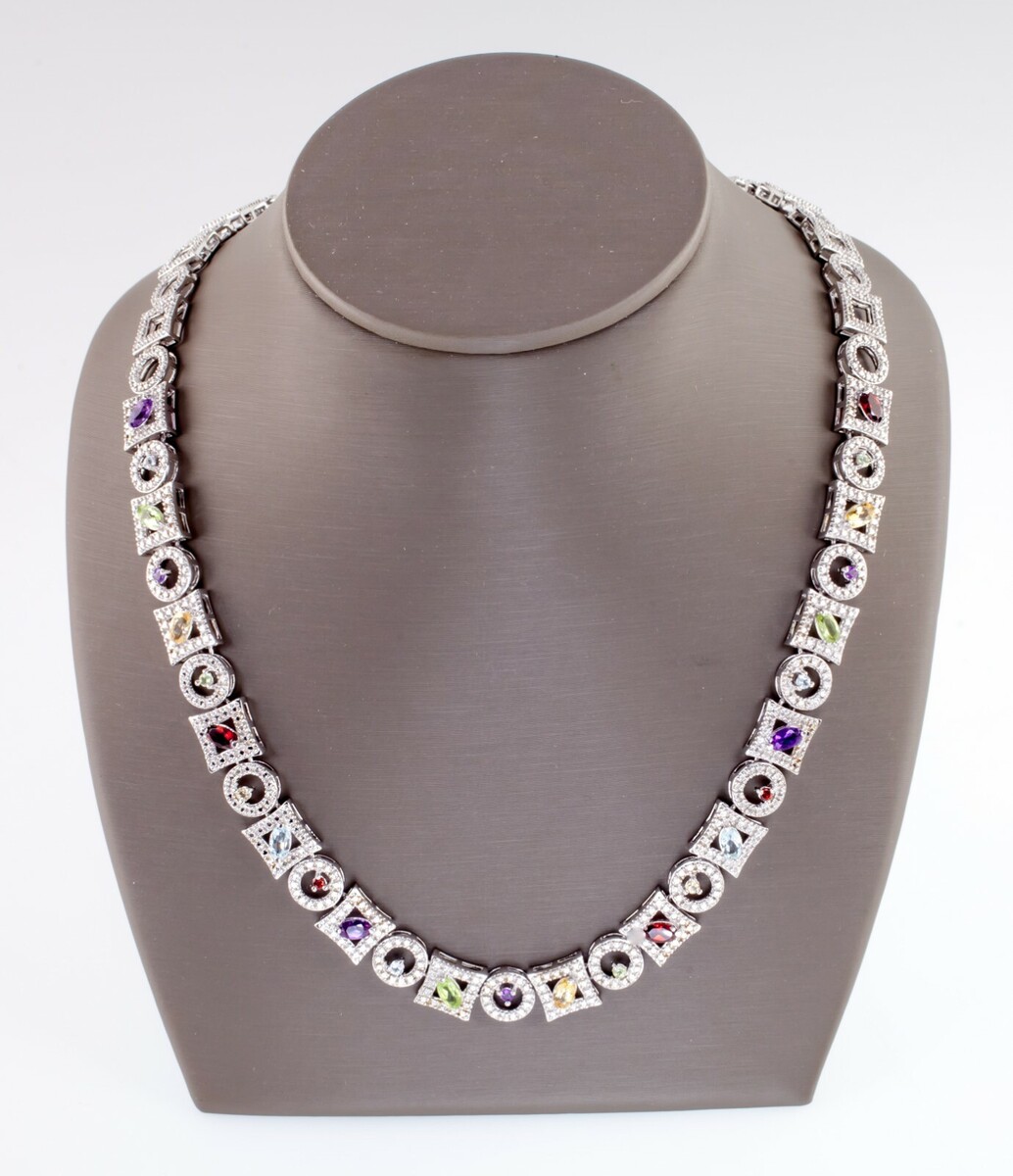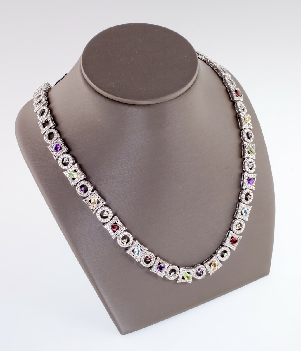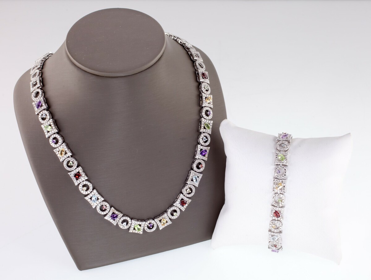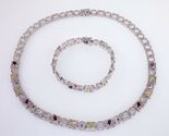 Gorgeous Multi Colors Genuine Gemstones Necklace Bracelet Set In Rhodium Plated Sterling