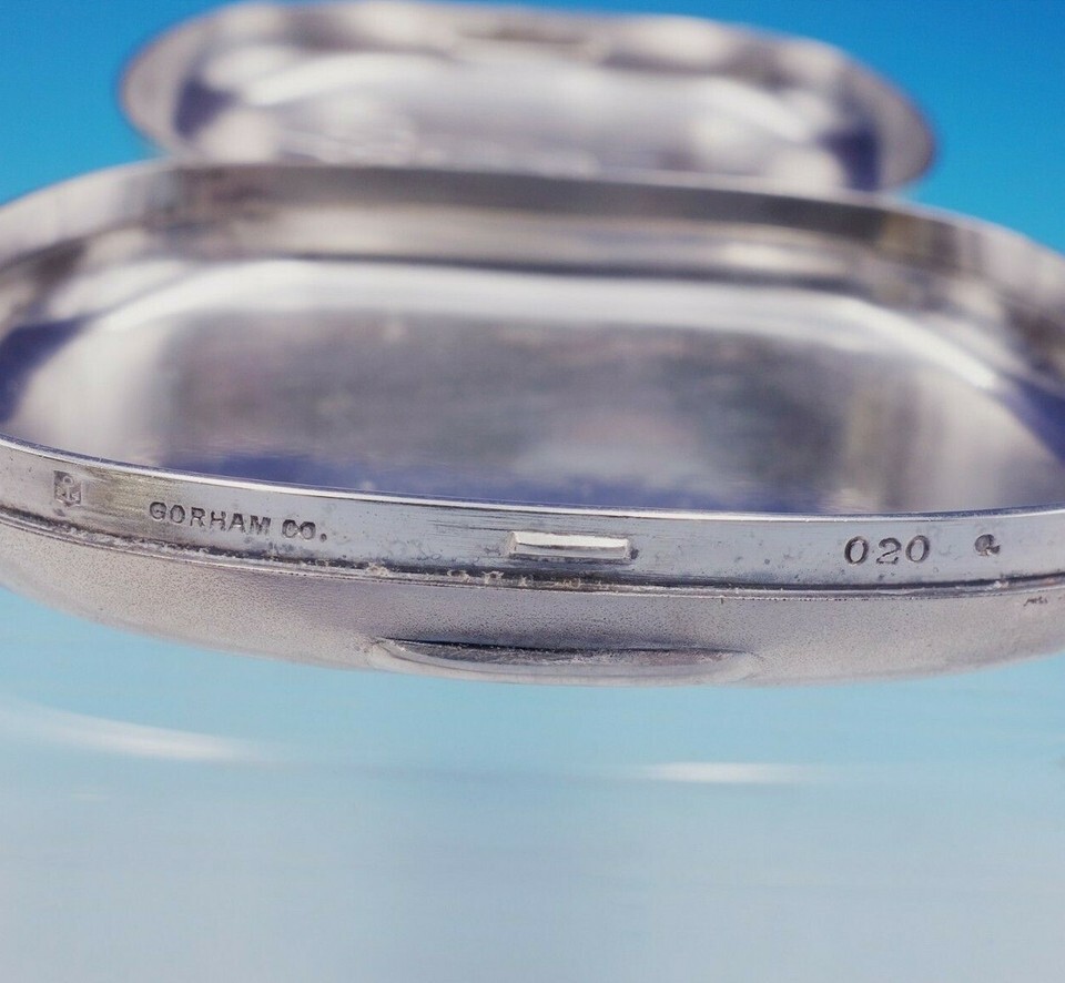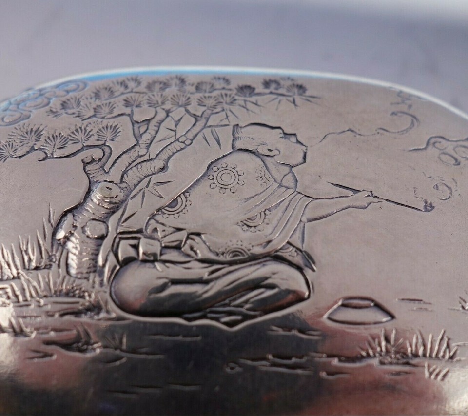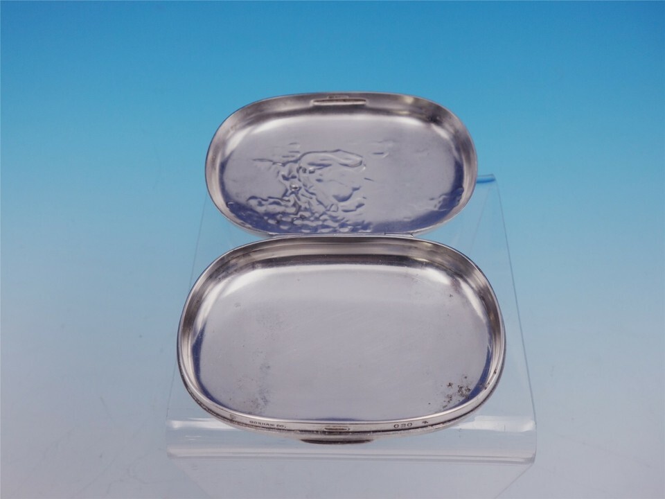Outstanding Gorham silverplate soap box marked #020. This piece features a chased scene of an oriental man smoking under a tree.