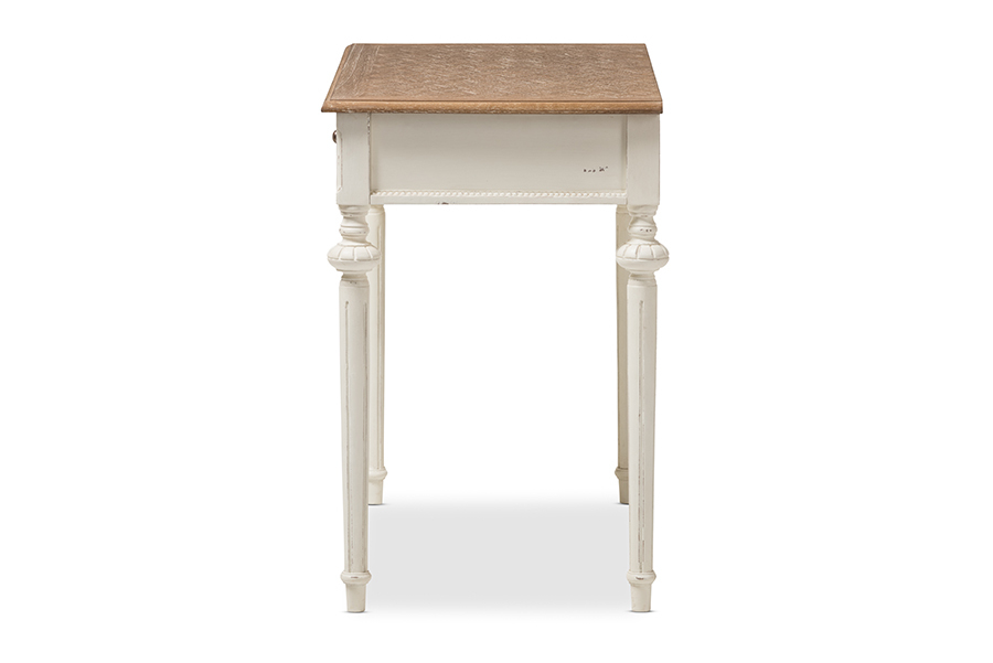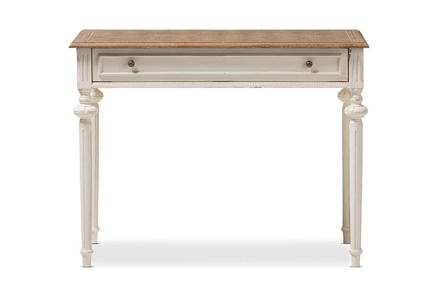 Traditional and contemporary elements work together in the Gosford French provincial style writing desk, giving it a timeless elegance. The gorgeous provincial design elements have been delicately restored and finished with a rustic iron handle, weathered oak wood top and distressed white polish. This writing desk with one drawer works beautifully in the living, entry, hallway, in addition to the home office. The neat proportions of this writing desk make it a functional piece for smaller spaces. The meticulously carved French fluted legs and corners and the frame details are paired beautifully with a classics white distressed finish, giving a traditional style desk a chic twist. Classical and functional, the Gosford writing desk is made in Indonesia. It requires assembly.