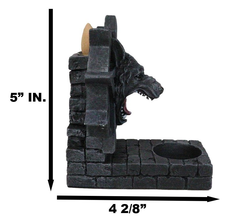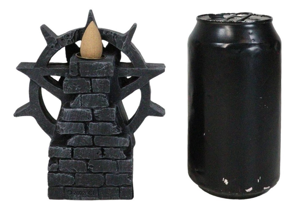 ? Immerse yourself in the mystical world with our Gothic Werewolf Pentagram Wheel Sculpture. The sculpture features an alpha werewolf within a pentagram wheel and medieval stone structures. The dual functionality allows you to use it both as a tea light candle holder and a backflow incense cone burner. Perfect for collectors of gothic and mystical aesthetics, this piece stands as a captivating tribute to the enigmatic nature of werewolves.