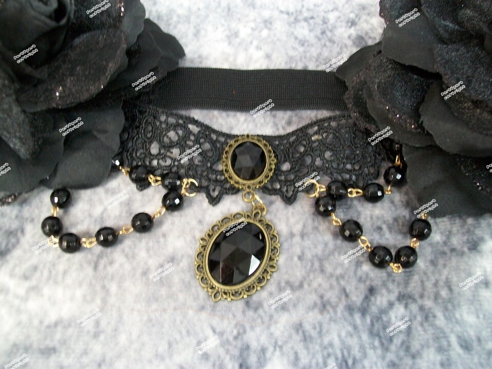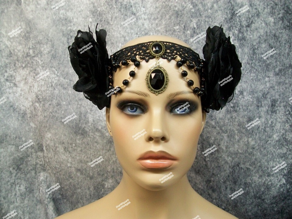 Gothic Black Flowers Costume Headpiece with Beads and Dangling Gems. Some of the petals of the Flowers have glitter. Glitter will shed. The flower petals are kind of smashed and go in all different directions. The circlet is a little big. Has a piece of elastic in the very back. I had to double the elastic over to get it to fit the mannequin. It will probably wear better over hair but take note that it may need pinned up for those will smaller heads. One Size fits most. DOES NOT INCLUDE MANNEQUIN.