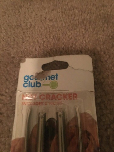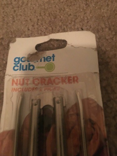 GOURMET CLUB NUT Shell CRACKER INCLUDES 2 PICKS new. The plastic is torn/bent/ and opened in places and the cardboard packing is torn and bent in places as well. No effects to the item itself.