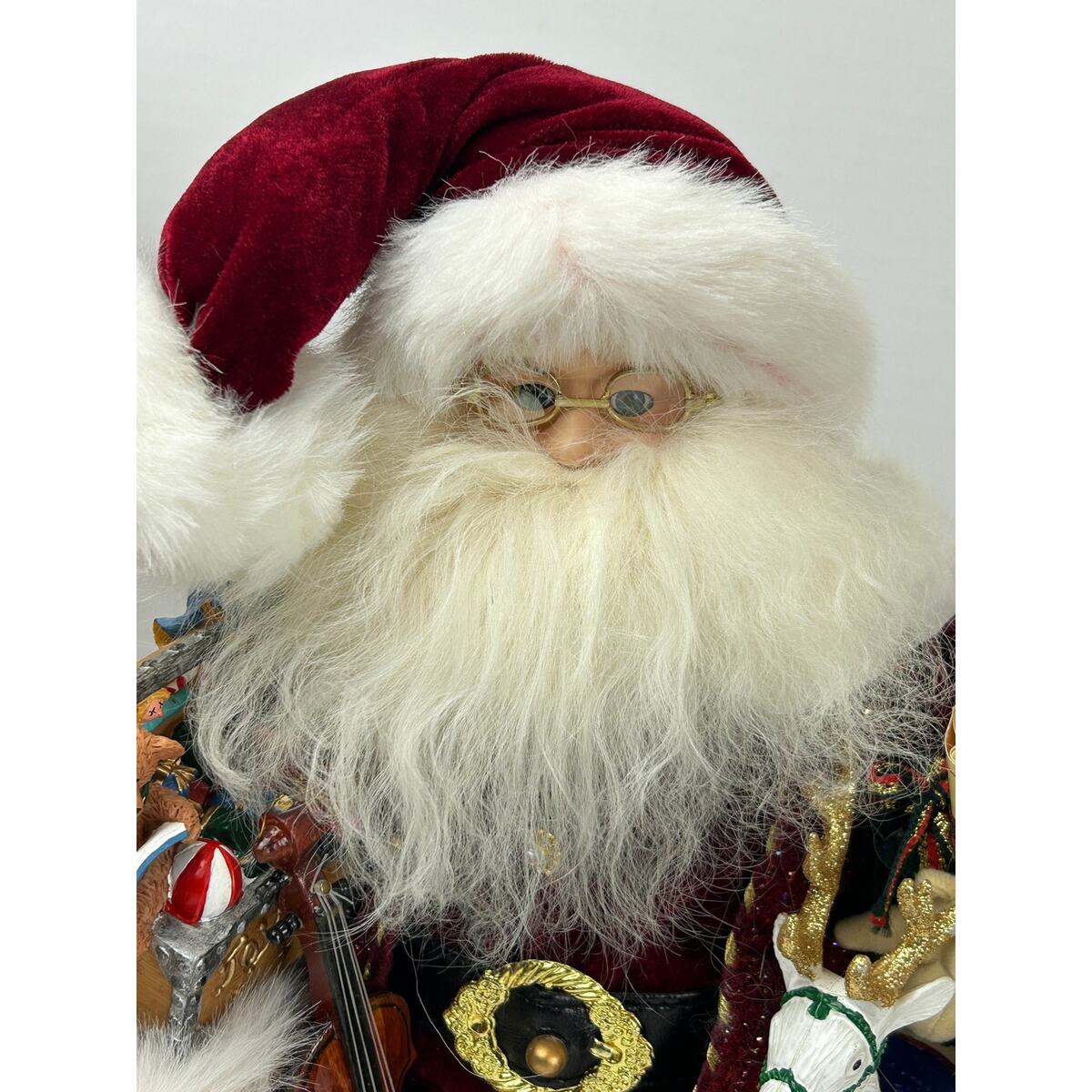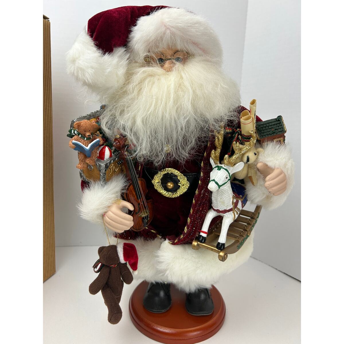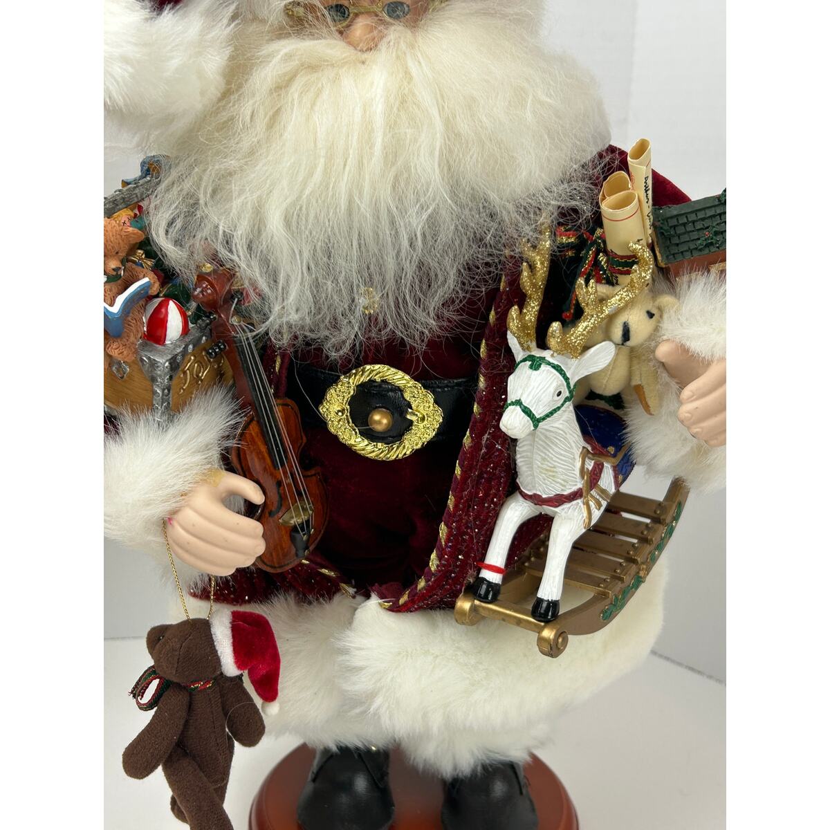 Features a richly detailed velvet outfit, faux fur trim, and gold accents. Santa carries a violin, teddy bear, and rocking horse with scroll list and other miniature toys.