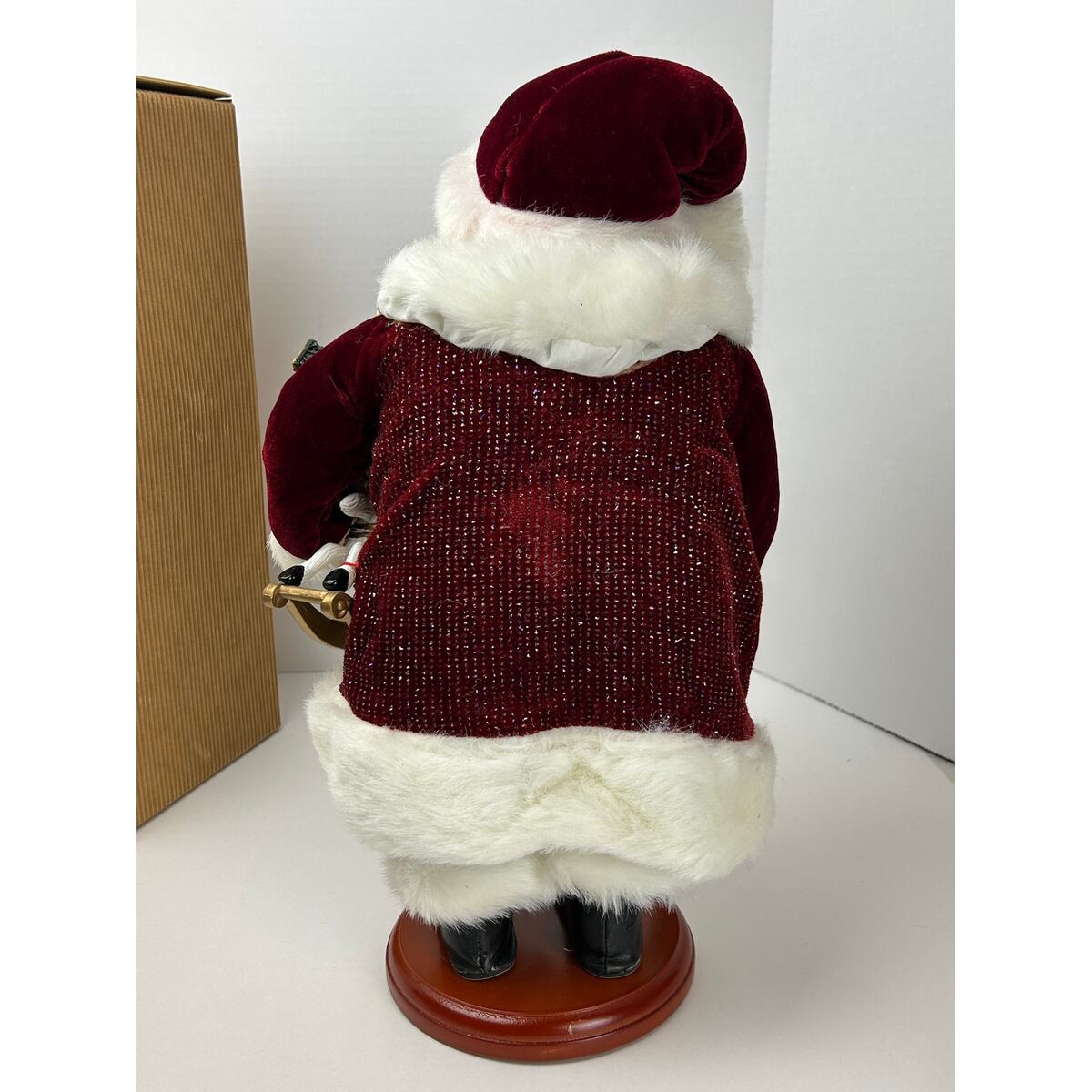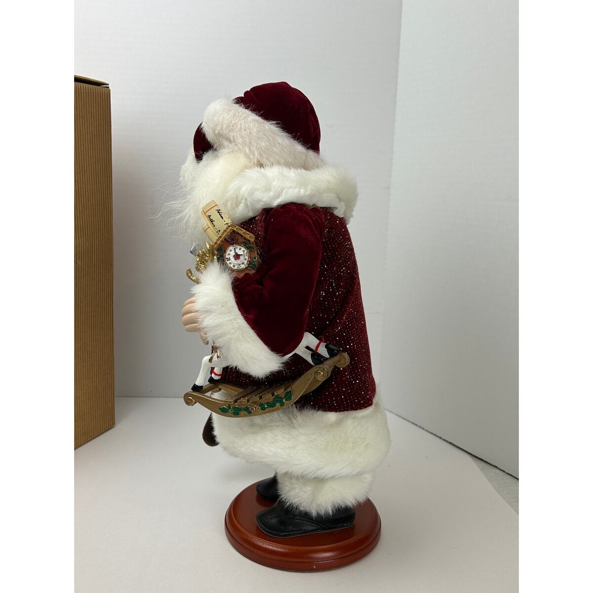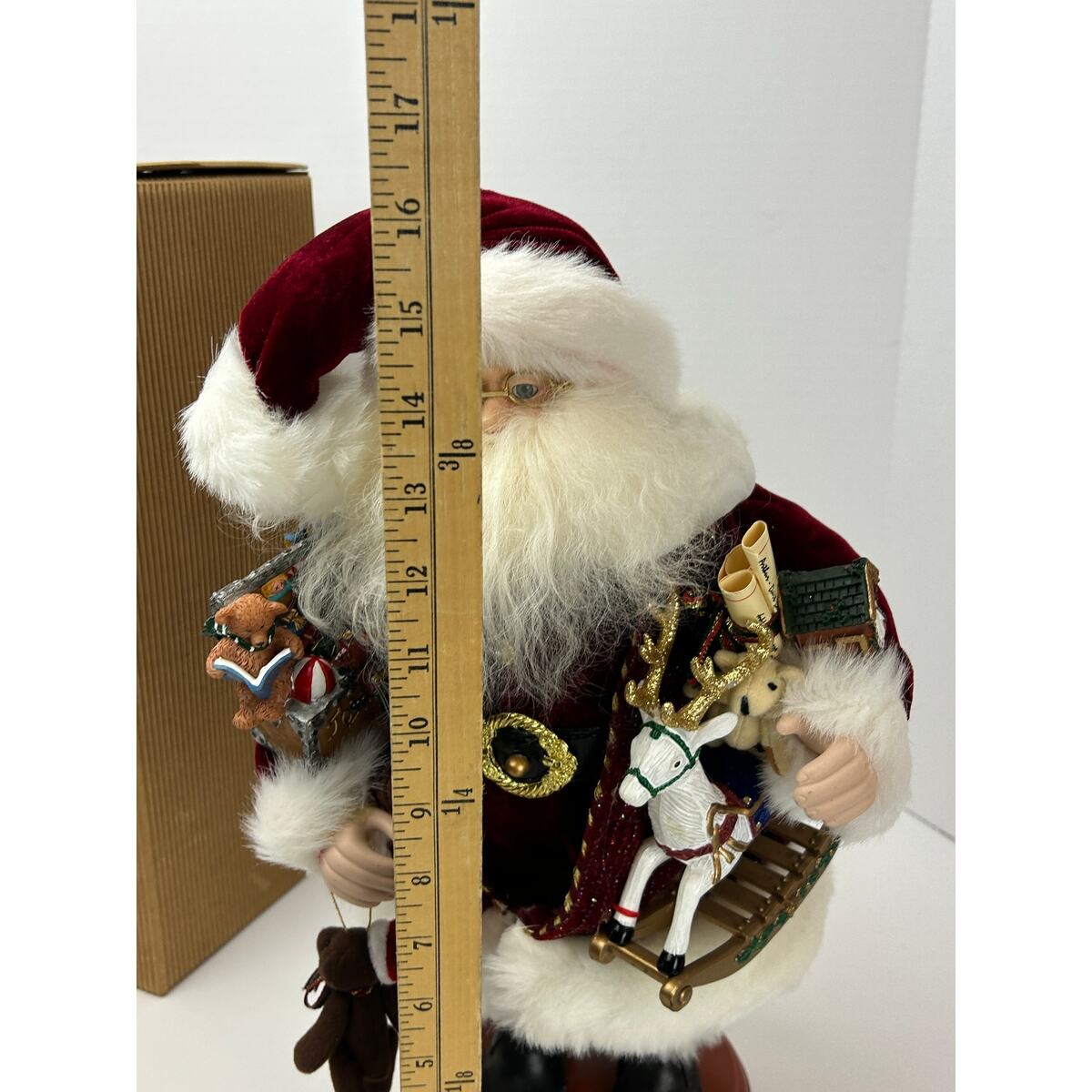 Features a richly detailed velvet outfit, faux fur trim, and gold accents. Santa carries a violin, teddy bear, and rocking horse with scroll list and other miniature toys.
