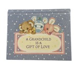 Blue background with white stars. A stuffed teddy bear, zebra and bunny peek over a sign that states " A GRANDCHILD IS A GIFT OF LOVE"