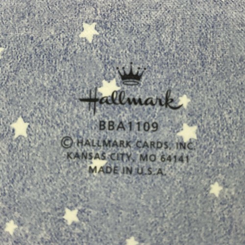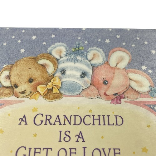 Blue background with white stars. A stuffed teddy bear, zebra and bunny peek over a sign that states " A GRANDCHILD IS A GIFT OF LOVE"