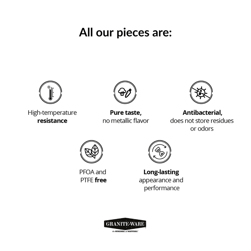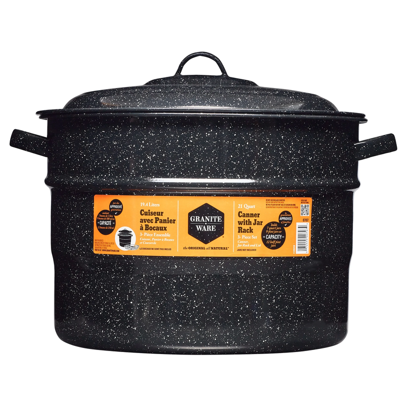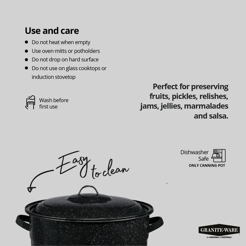 Ready, Set, Can! WHAT'S IN THE BOX: 21.5 qt water bath canning pot with lid and Jar Rack. EASY TO HANDLE JAR RACK: The chromed steel jar rack can securely hold 7 one-quart jars, 9 pint jars, or 12 half-pint jars. Preserve HIGH-ACID FOODS such as lemons, pickles, apples, berries, and more through canning. From jams and jellies to pickles, salsas, and stews. Experience UNIFORM and RAPID HEAT with our enameled steel material. TOXIN FREE: Our product is free from harmful substances like PFOA and PTFE, ensuring a cooking experience that is both safe and reliable. EFFORTLESS CLEANING: All of our Granite Ware products are Dishwasher Safe. Our products are versatile and efficient,