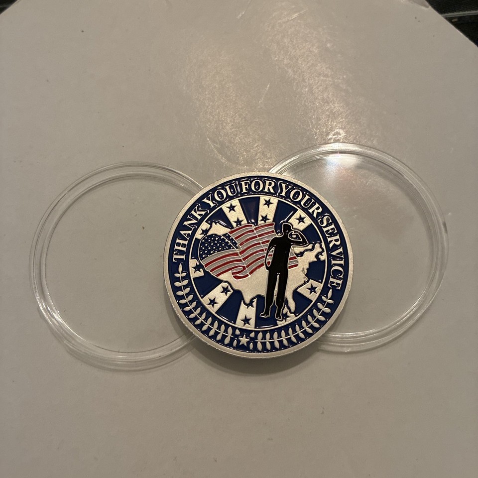 This Grateful Nation Never Forget POW/MIA Challenge Coin is a powerful tribute to those who served. The front features an eagle against an American flag background with the inscription "YOUR NATION PROUDLY SALUTES YOU". The reverse side displays a silhouette of a soldier saluting in front of a map of the USA and a flag, surrounded by "THANK YOU FOR YOUR SERVICE". This collectible coin is in excellent condition and comes in a protective plastic casing, making it a perfect gift for veterans, service members, or anyone wishing to honor their sacrifice. A timeless piece to remember and appreciate.