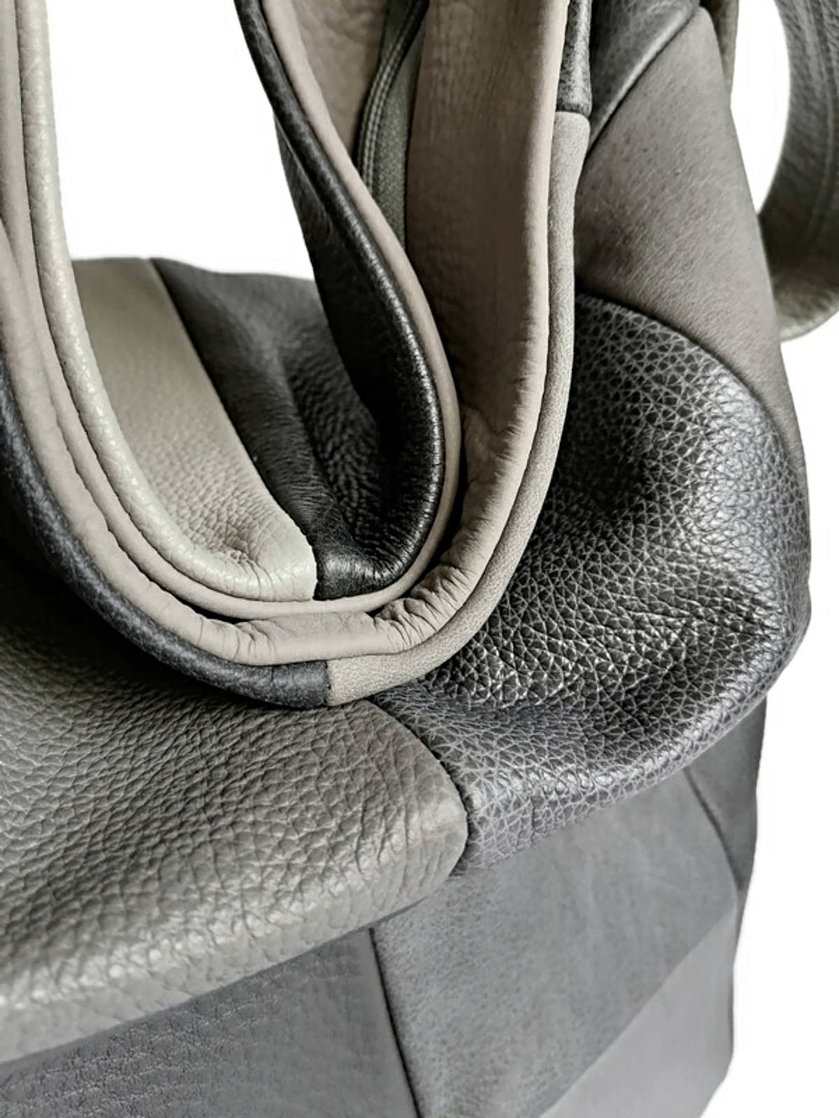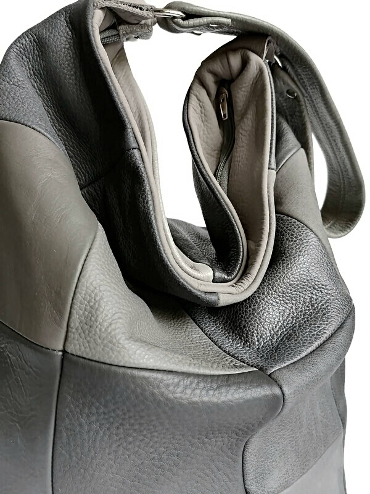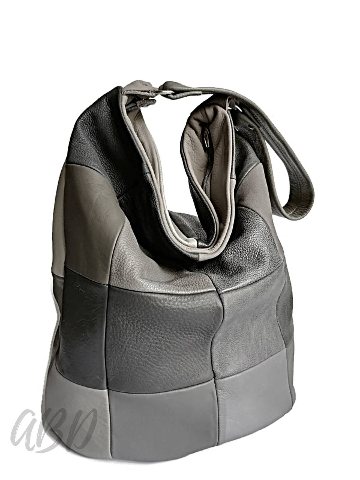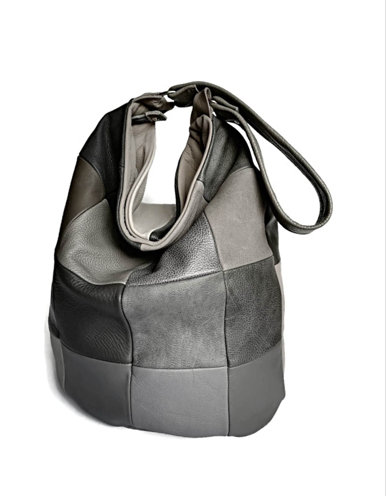 - Gray Patchwork Leather Hobo Bag: Handmade Shoulder Tote
