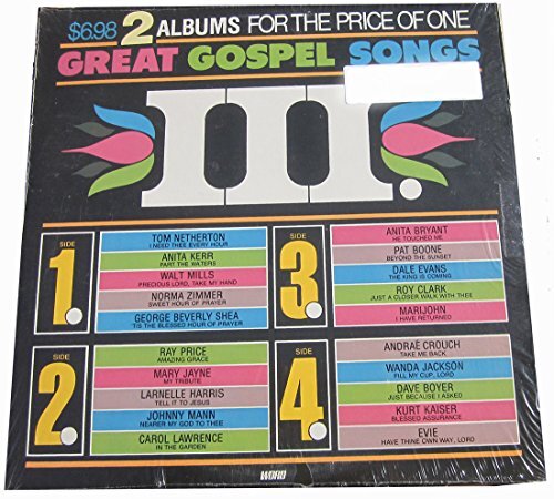 Product description: Two Album set - GREAT GOSPEL SONGS - III. It is a Word Records production. Selections include: I Need Thee Every Hour - Tom Netherton, Part the Waters - Anita Kerr, Precious Lord Take My Hand - Walt Mills, Sweet Hour of Prayer - Norma Zimmer, 'Tis the Blessed Hour of Prayer, Amazing Grace - Ray Price, My Tribute - Mary Jayne, Tell It to Jesus - Larnelle Harris, Nearer My God to Thee - Johnny Mann, In the Garden - Carol Lawrence, He Touched Me - Anita Bryant, Beyond the Sunset - Pat Boone, The King is Coming - Dale Evans, Just a Close Walk With Thee - Roy Clark, I Have Returned - Marijohn, Take Me Back - Andrae Crouch, Fill My Cup Lord - Wanda Jackson, Just Because I Asked - Dave Boyer, Blessed Assurance - Kurt Daiser, Have Thine Own Way Lord - Evie.
