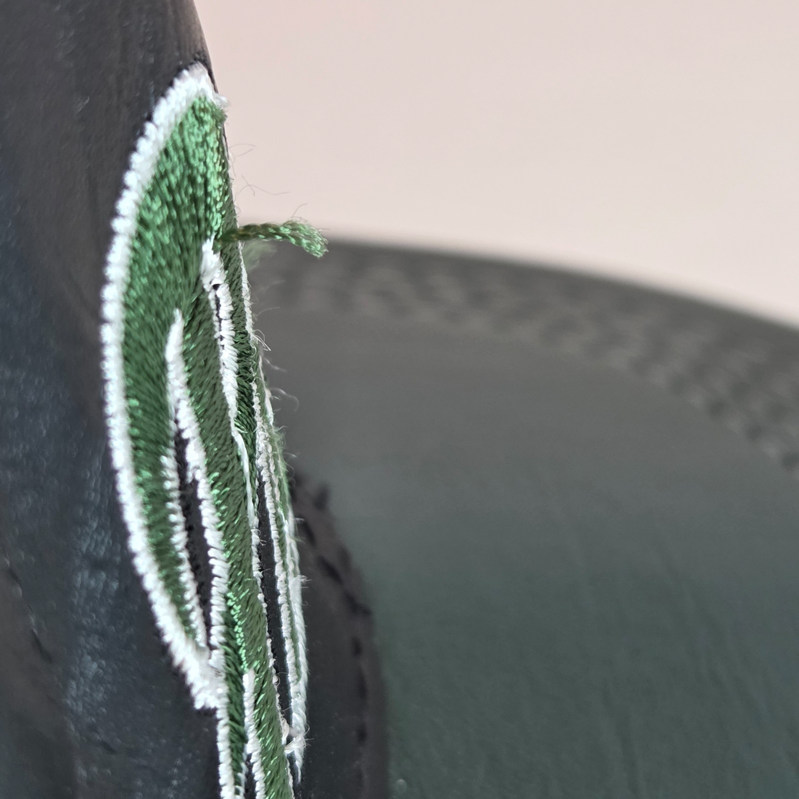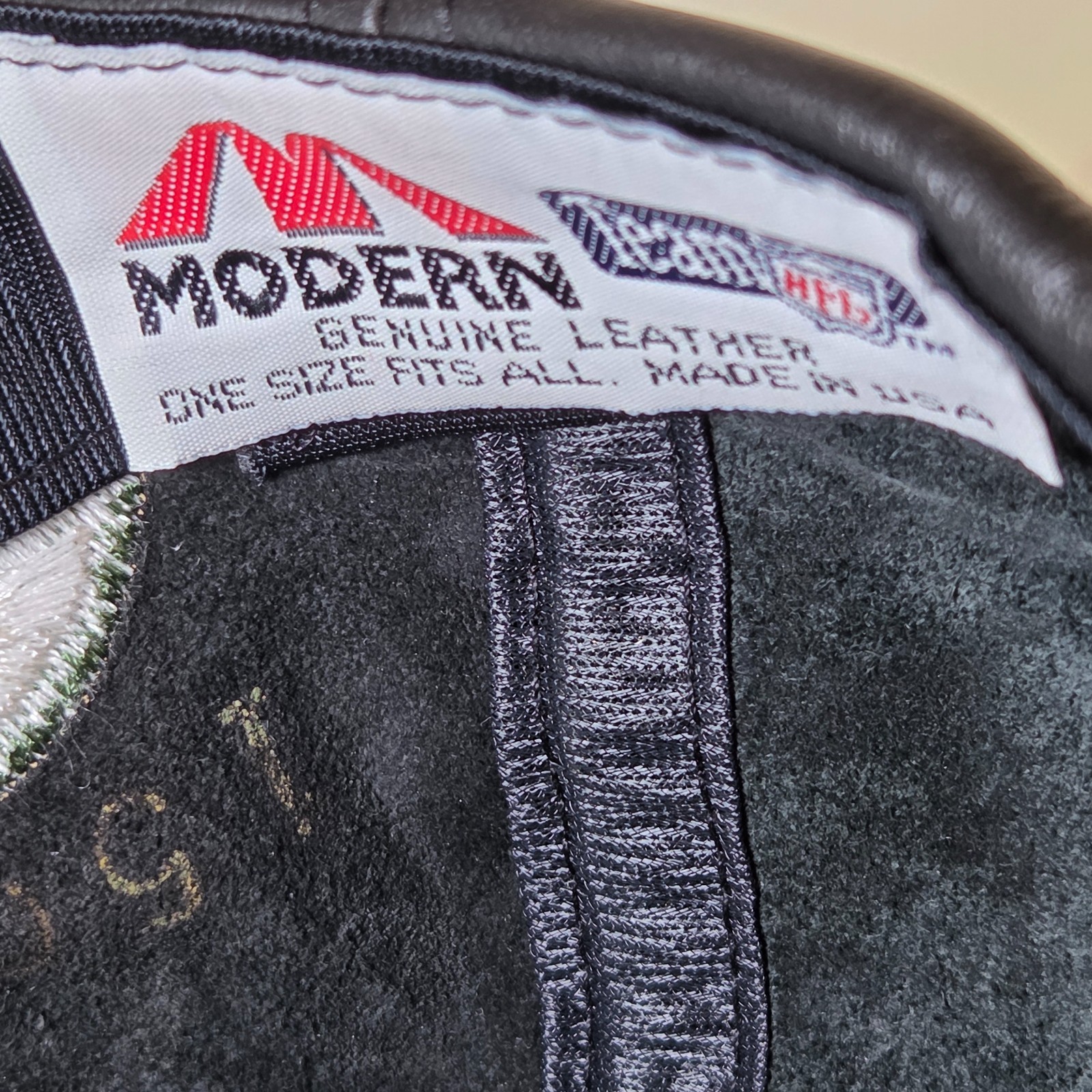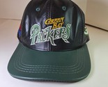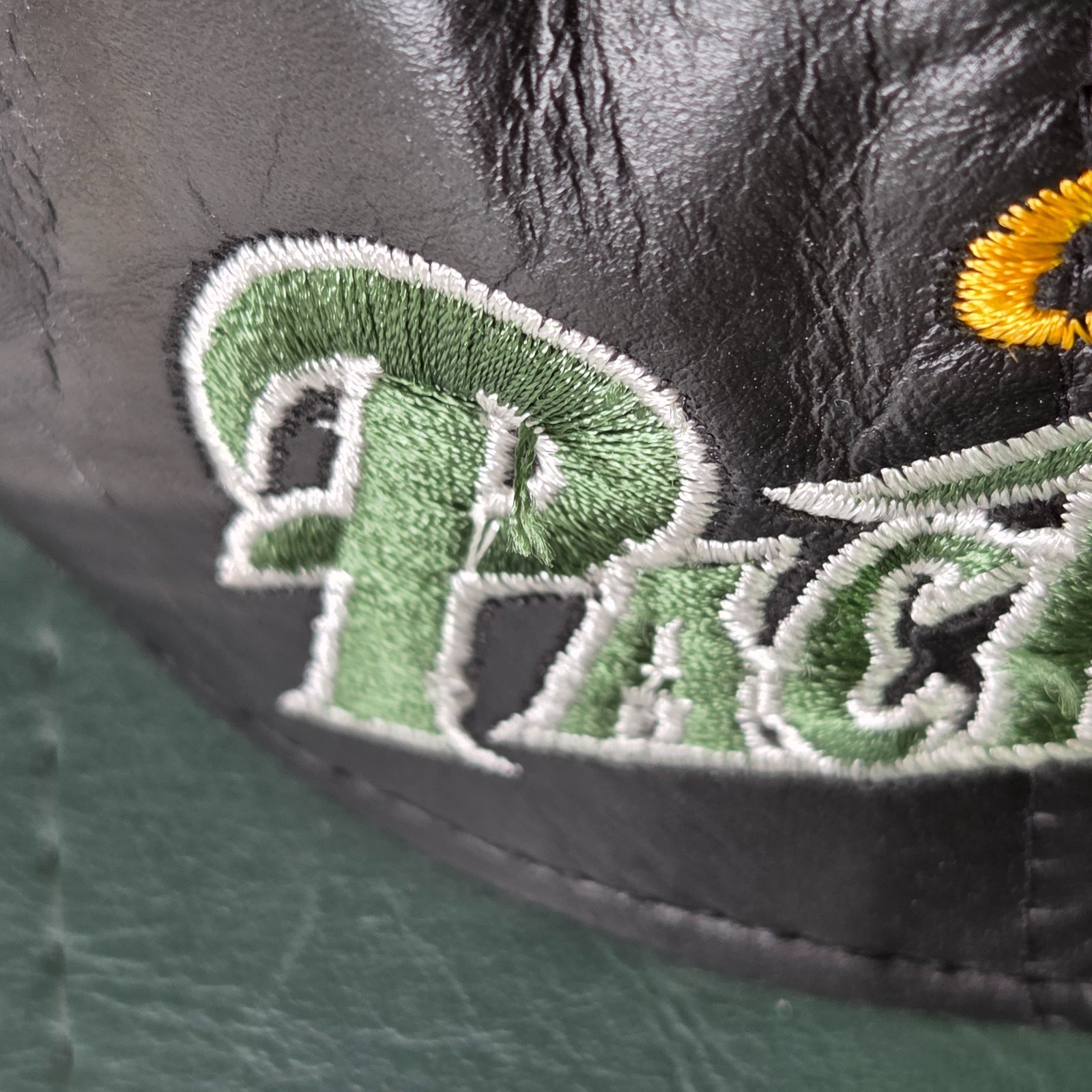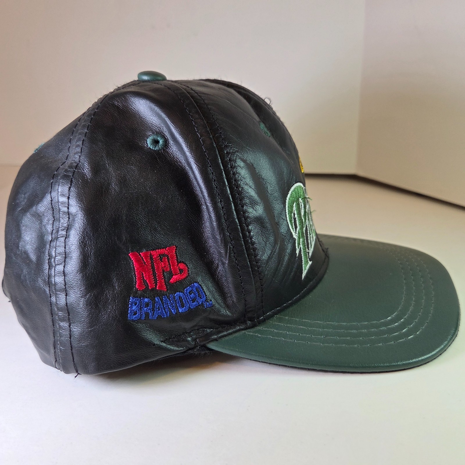 This rare vintage Green Bay Packers leather snapback cap by Modern Cap features bold embroidered graphics on a sleek black leather crown with a green bill. Made in the USA, this officially licensed NFL Branded hat is a standout collectible for any Packers fan. It shows signs of wear including a tear along the brim seam and loose stitching?see photos for details.