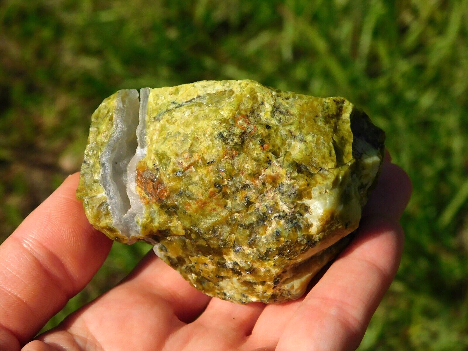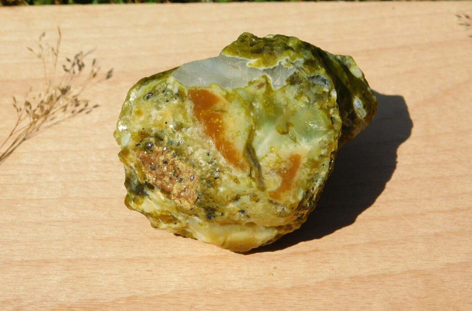 This Unique Green Opal Specimen has Beautiful Rich Shades of Green with some Orange Opal. This One-of-a-Kind Specimen also Displays Clear Agate Cavities and a Wonderful Healing Energy!