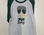 Casual graphic t-shirt with green sleeves and a fun design on the front.