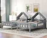 Double Twin Size Platform Bed with House-shaped Headboard and a Built-in Nightstand, Grey