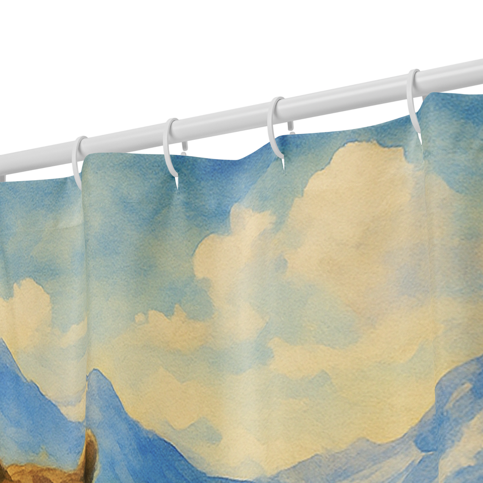 Bring the beauty of the Alaskan wilderness into your bathroom with this stunning shower curtain, featuring a watercolor-style illustration of a family of grizzly bears relaxing in a sunlit meadow. With wildflowers blooming at their feet and majestic mountains in the background, this design captures the peaceful charm of nature.