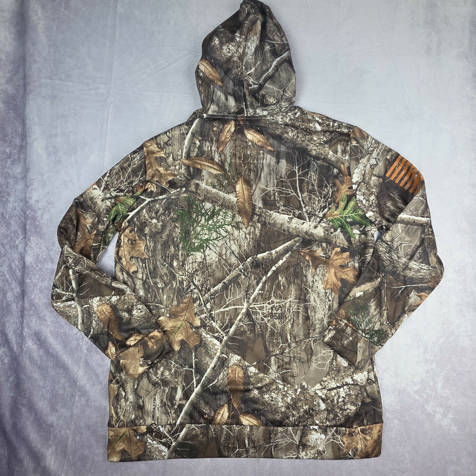 The Grunt Style Hoodie is a men's large pullover hoodie featuring a Realtree camo design with a beer season graphic. Made from polyester knit fabric, this hoodie is machine washable and has a crew neck and long sleeves. It is designed for all seasons and has a regular fit with accents of a logo. The hoodie is suitable for various activities like gym training, walking, and running, and it has a patriotic theme with elements of the army, USA flag, and veterans. With its hooded style and pockets, this hoodie is perfect for those who appreciate military themes and outdoor activities.