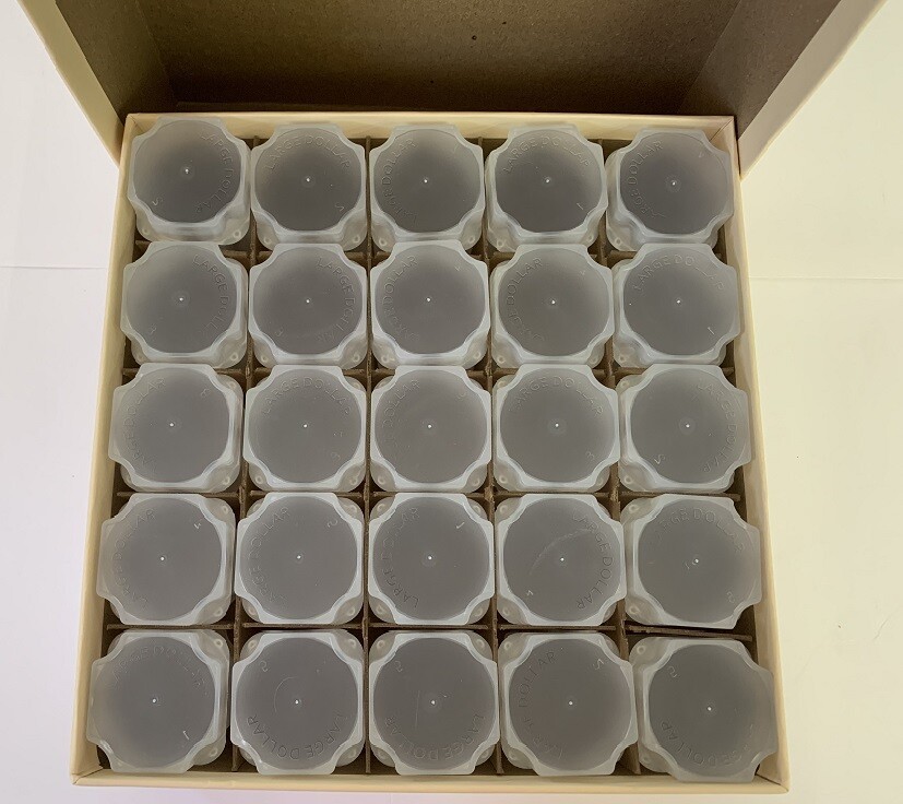 Guardhouse Large Dollar/Tan heavy-duty coin tube boxes with 25 Large Dollar Guardhouse square coin tubes. These boxes are designed to perfectly accommodate 25 round or square coin tubes. Guardhouse heavy-duty coin tube boxes feature re-enforced tape filaments and internal dividers constructed of thick, multilayer chipboard. Guardhouse coin tube boxes have a high quality exterior, are manufactured with thumb-cut notches and are ideal for shipping or storage. Each tube holds 20 large dollars such as Eisenhower, Morgan, Peace or any 38.1mm coin. Guardhouse brand square coin tubes feature a unique, proprietary design and are the perfect solution for storing your large dollars. Sleek and ergonomic, the Guardhouse translucent snap-tight lids and tubes allow for easy identification of their contents and stack for tidy storage. Bulk Guardhouse brand coin tube boxes are clearly labeled to identify contents.