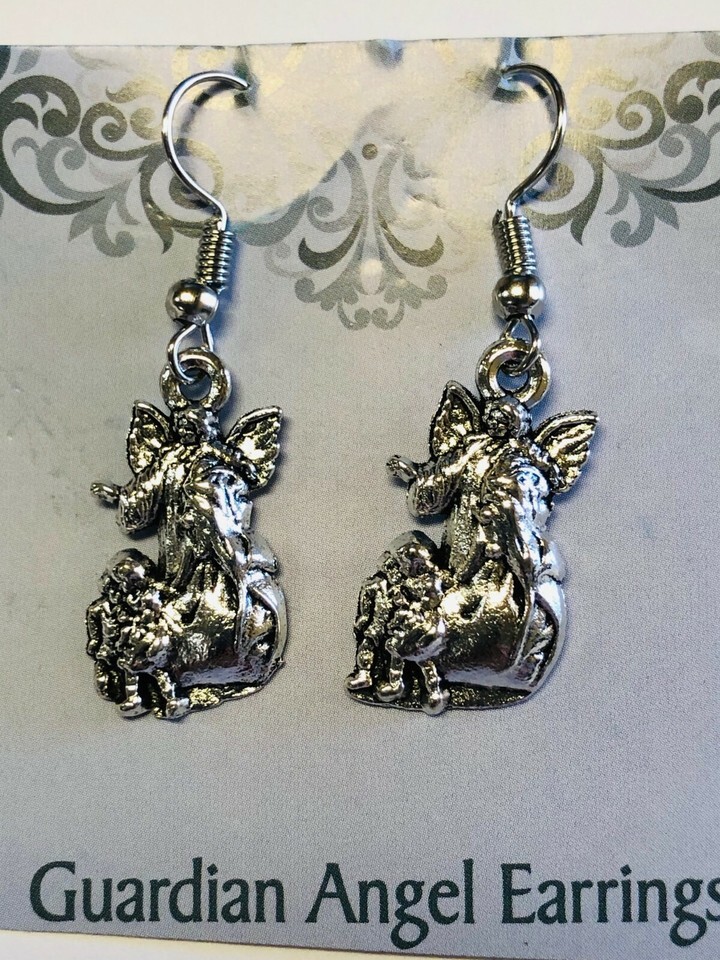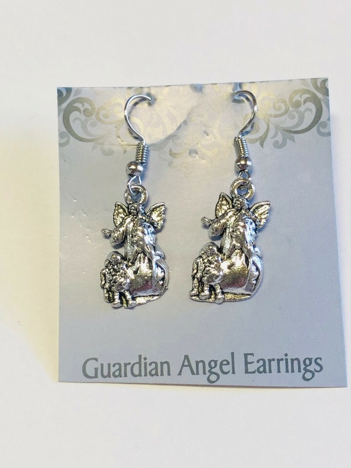 You are purchasing a very nice pair of 1 1/2" long guardian angel earrings. They come with a hypoallergenic wire and a fish hook for easy wear. They are silver plated.