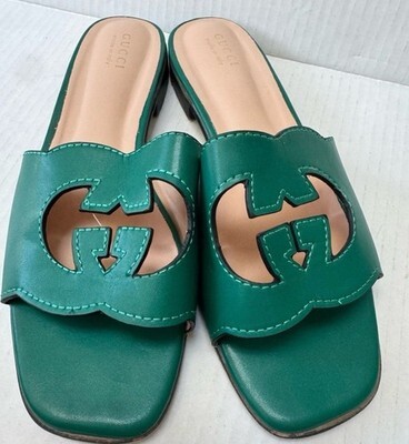 - Gucci Green Leather Cut Out Flat Sandals Slide Size 40 9 9.5