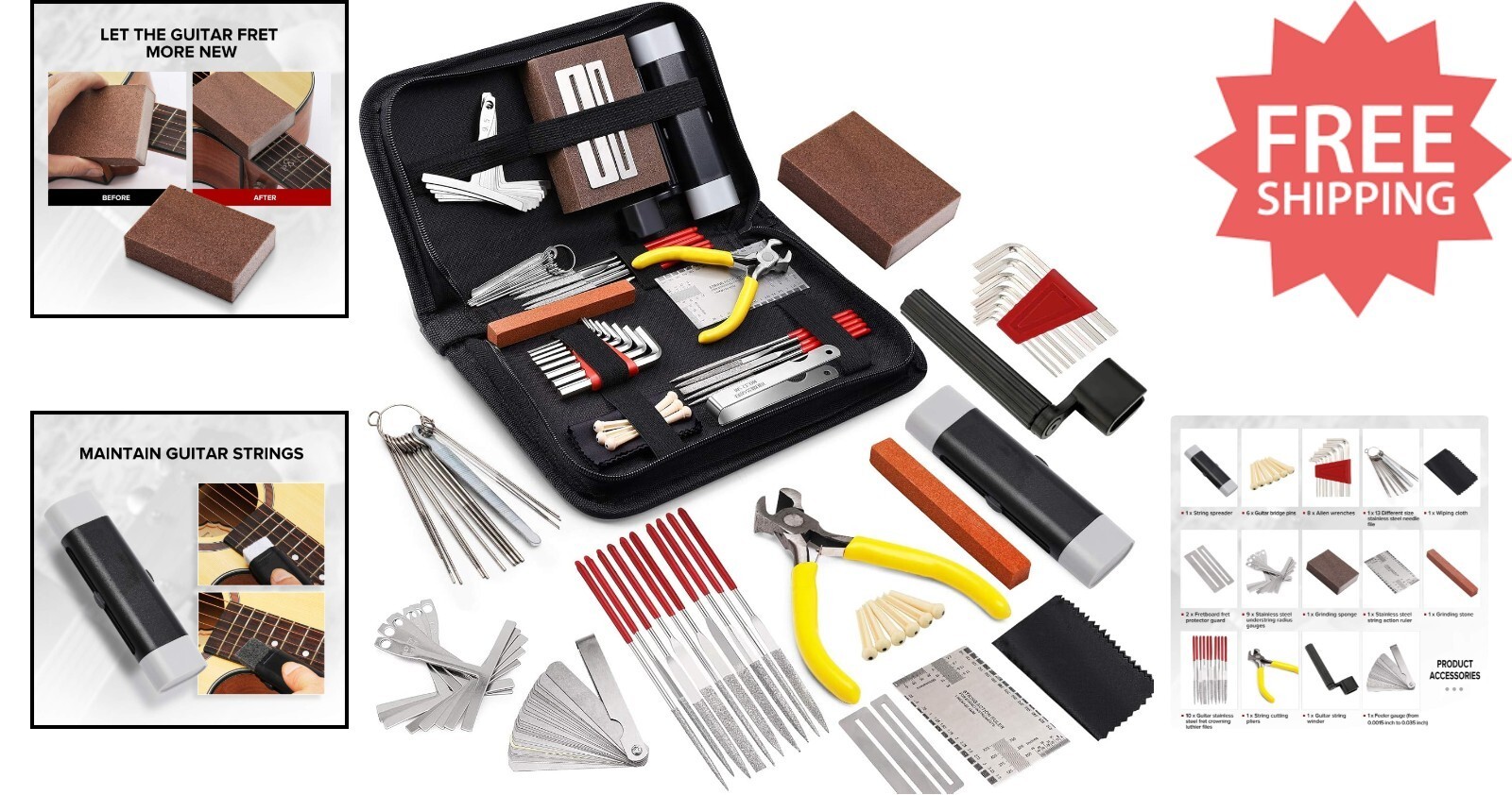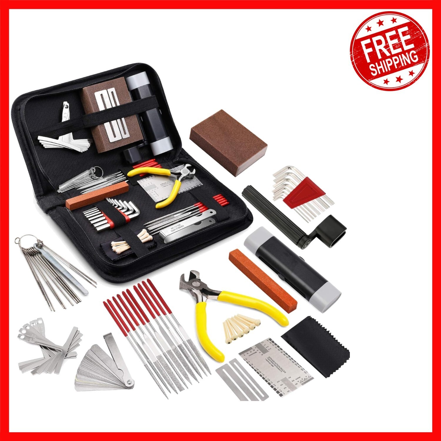 This comprehensive guitar maintenance and repair toolkit includes a wide range of professional-grade tools such as stainless steel fret crowning files, understring radius gauges, Allen wrenches, bridge pins, a string winder, cutting pliers, feeler gauges, needle files, a string action ruler, fret protectors, a string spreader, grinding accessories, and a convenient carrying case. Designed for luthiers, guitar enthusiasts, and repair professionals, it offers multifunctionality?perfect for changing strings, setting tone, adjusting action, and cleaning or maintaining your instruments. Compact and portable, the set is an ideal gift for both beginners and seasoned musicians, ensuring precise adjustments for guitars, basses, banjos, mandolins, and other stringed instruments. To ensure fast and reliable delivery, we work with multiple fulfillment partners and suppliers. Depending on availability and location, your order may ship from different warehouses or arrive in packaging that varies from item to item. Tracking details are typically provided shortly after shipment, and customer satisfaction remains our top priority.