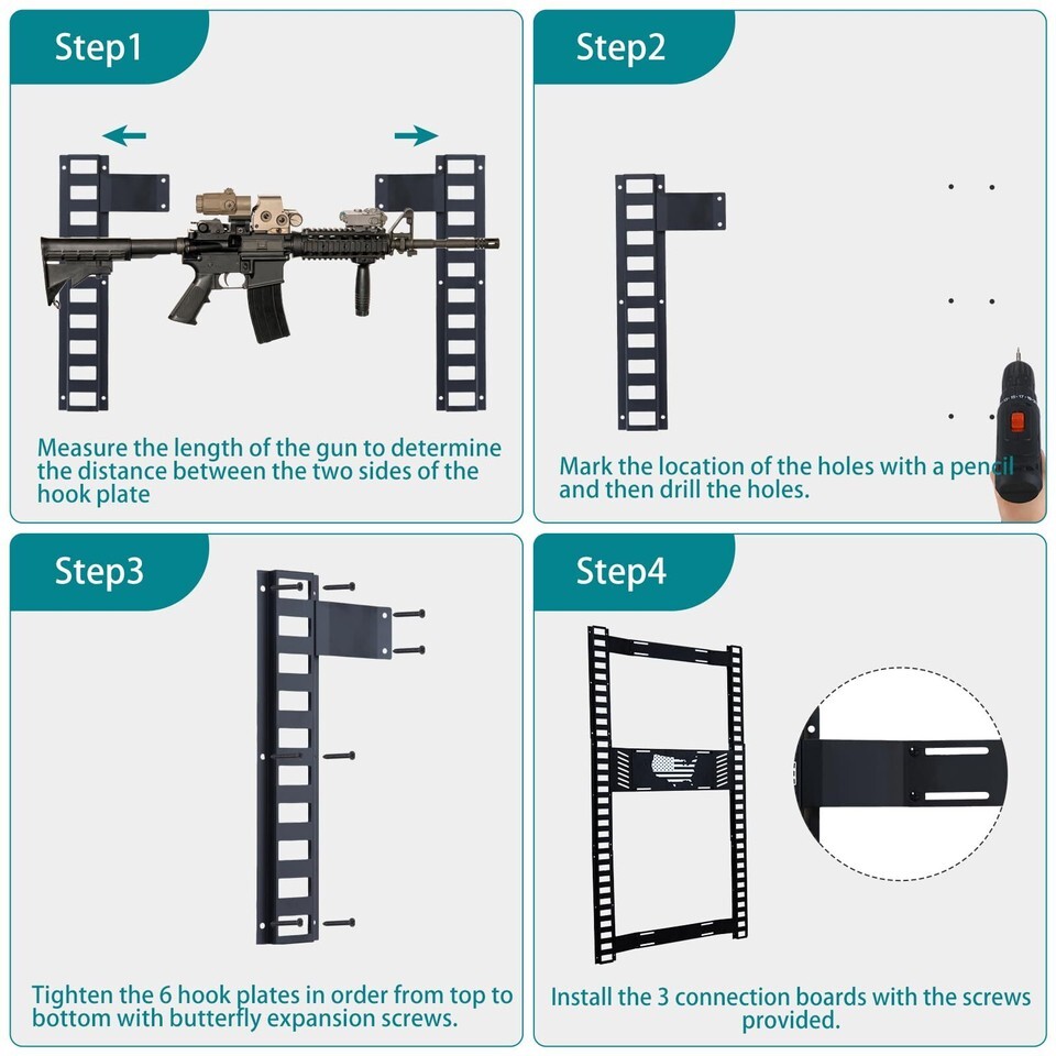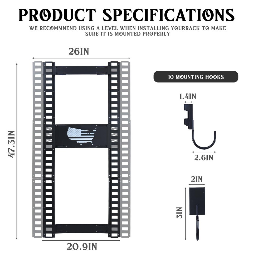 Practical Adjustable Design: this gun rack for wall features an adjustable design that allows you to adjust the spacing; The gun rack has a modular assembly design; It consists of 3 pairs of 6 slot plates and 3 adjustable width connecting plates; By adjusting the spacing between the 3 pairs of slots and 10 hooks, you can arrange your guns and bows in a more optimal way