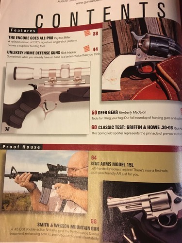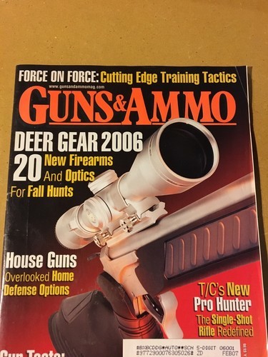 Guns Ammo Aug 2006 , House Guns, Over Looked Home Defense Options, Smith and Wesson Mountain Gun, Griffin and Howe .30-06, Ackleys .280, 20 New Firearms for Deer Hunting. 80 pages in good condition, some small wrinkling on page corners is present.