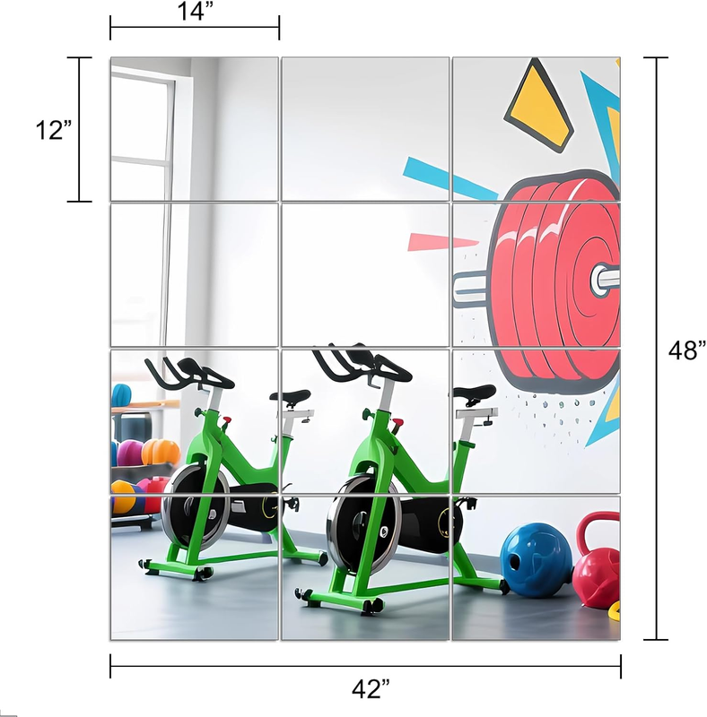 Gym Mirror Tiles - 14" X 12" X 12Pcs Wall Mounted Mirror Glass Frameless Full Length Mirror Tiles for Home Gym, Bedroom, Door Bathroom