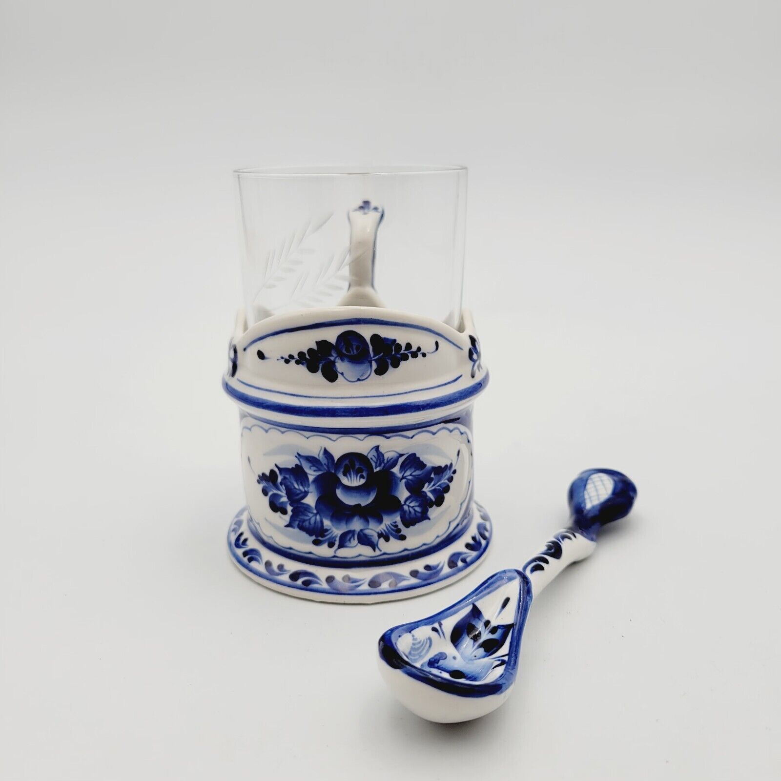 - Gzhel Cup Glass Holder crystal lead glass tea spoon set Signed