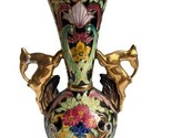 This vase is a beautiful example of Art Deco style, popular in Belgium during the 1920s and 1930s. It is made of ceramic and features a black base with vibrant floral designs and gold accents. The two antelope handles are a common feature in Art Deco vases, and they add a touch of whimsy to the design. Overall, great condition for its age.