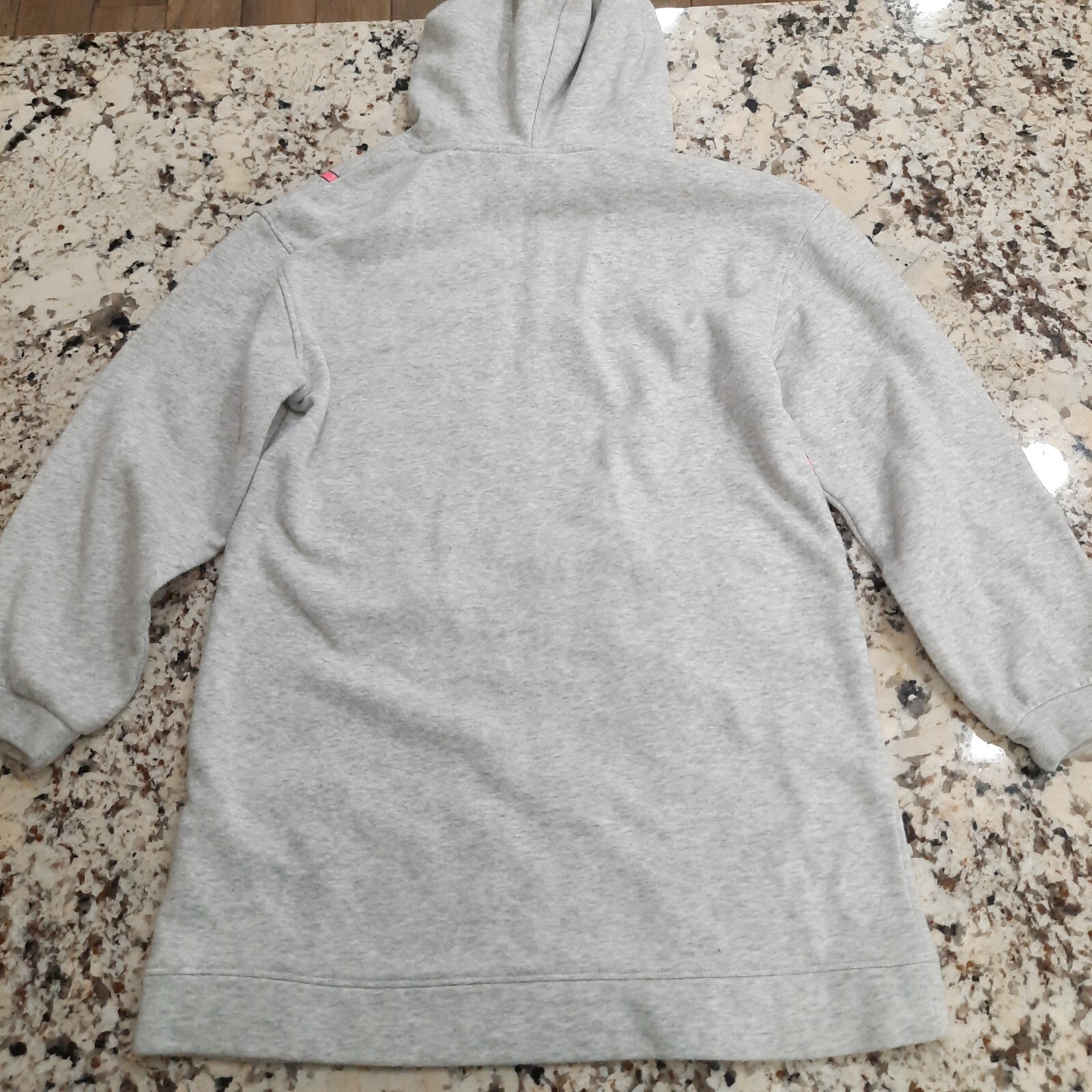 Some wash wear. Longer almost tunic length. See pics for measurements. Grey heather sweatshirt with some glitter accents and applique accent.