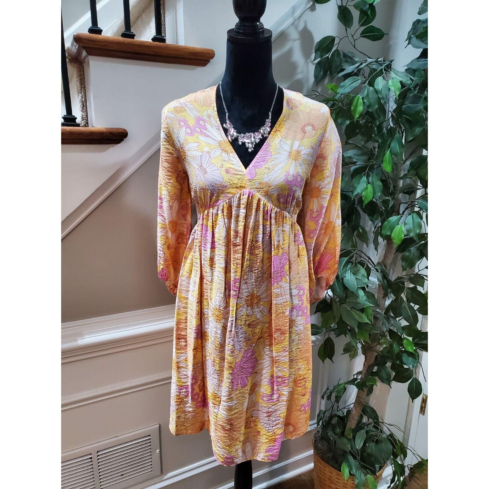 H M Women's Yellow Floral Viscose V-Neck Long Sleeve Knee Length Dress Size M.