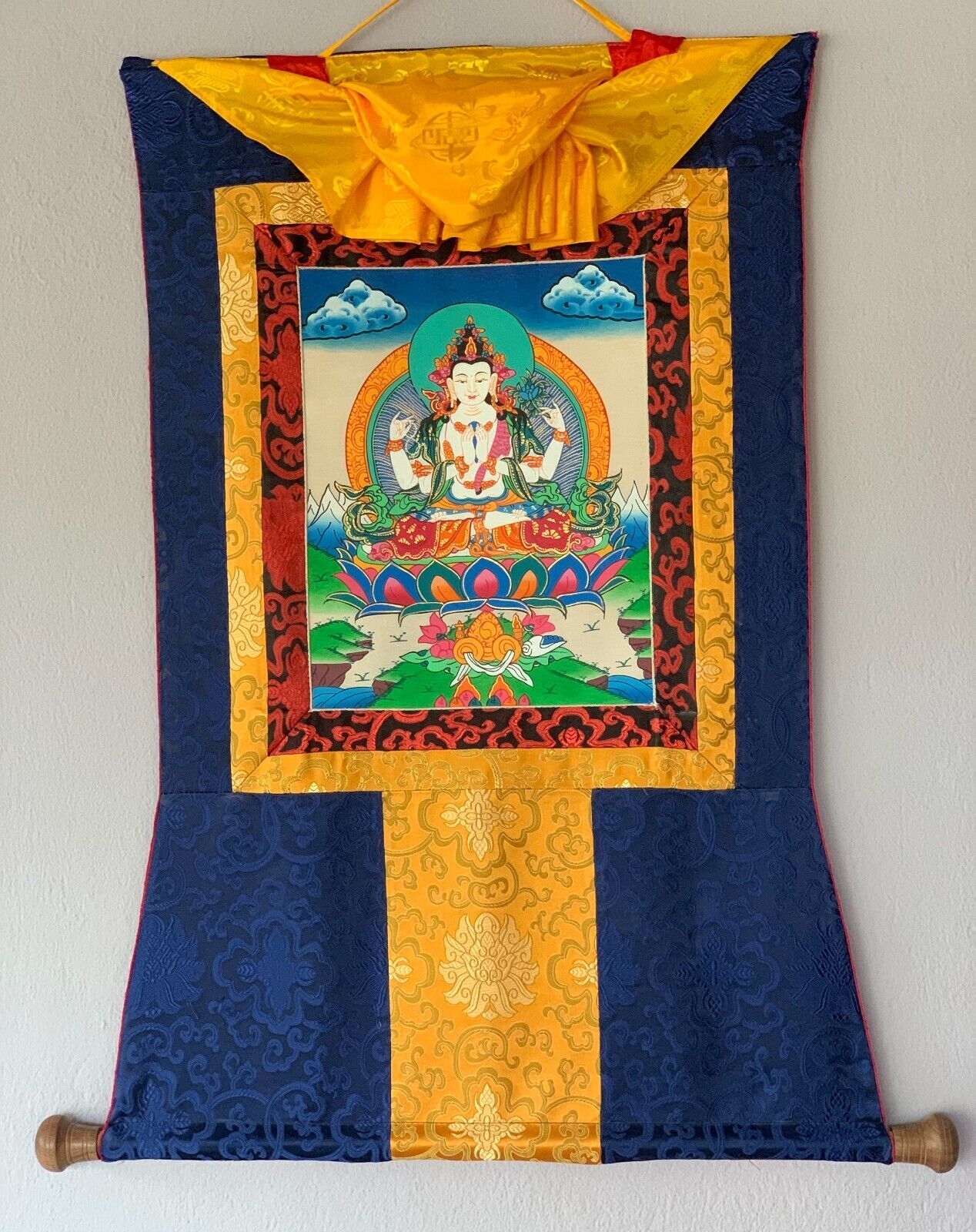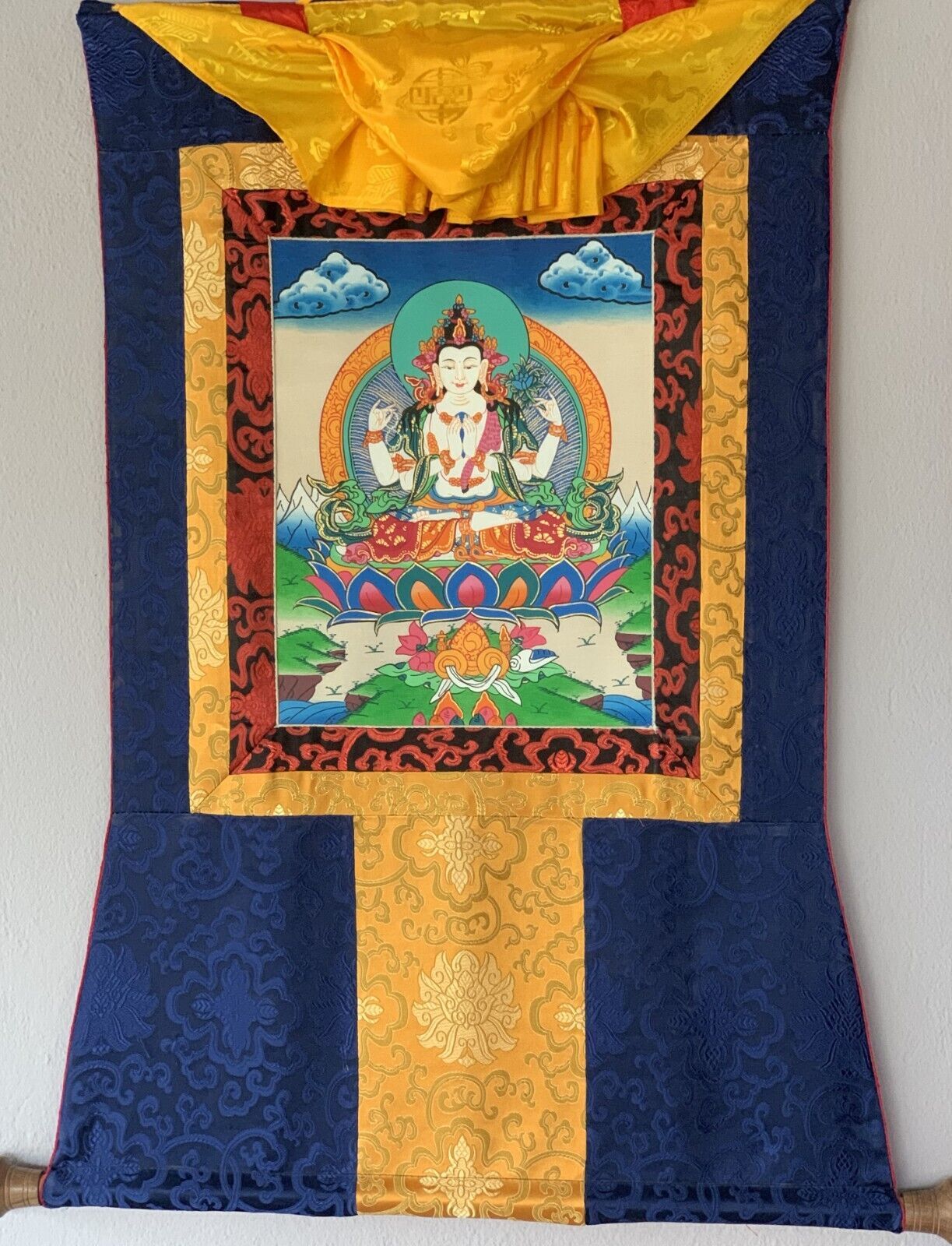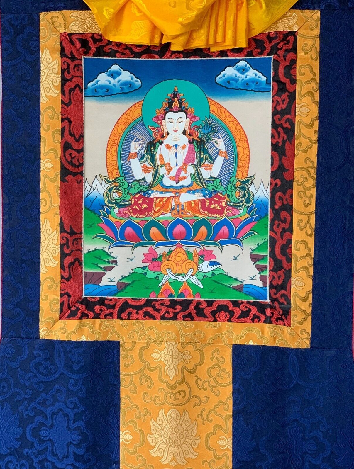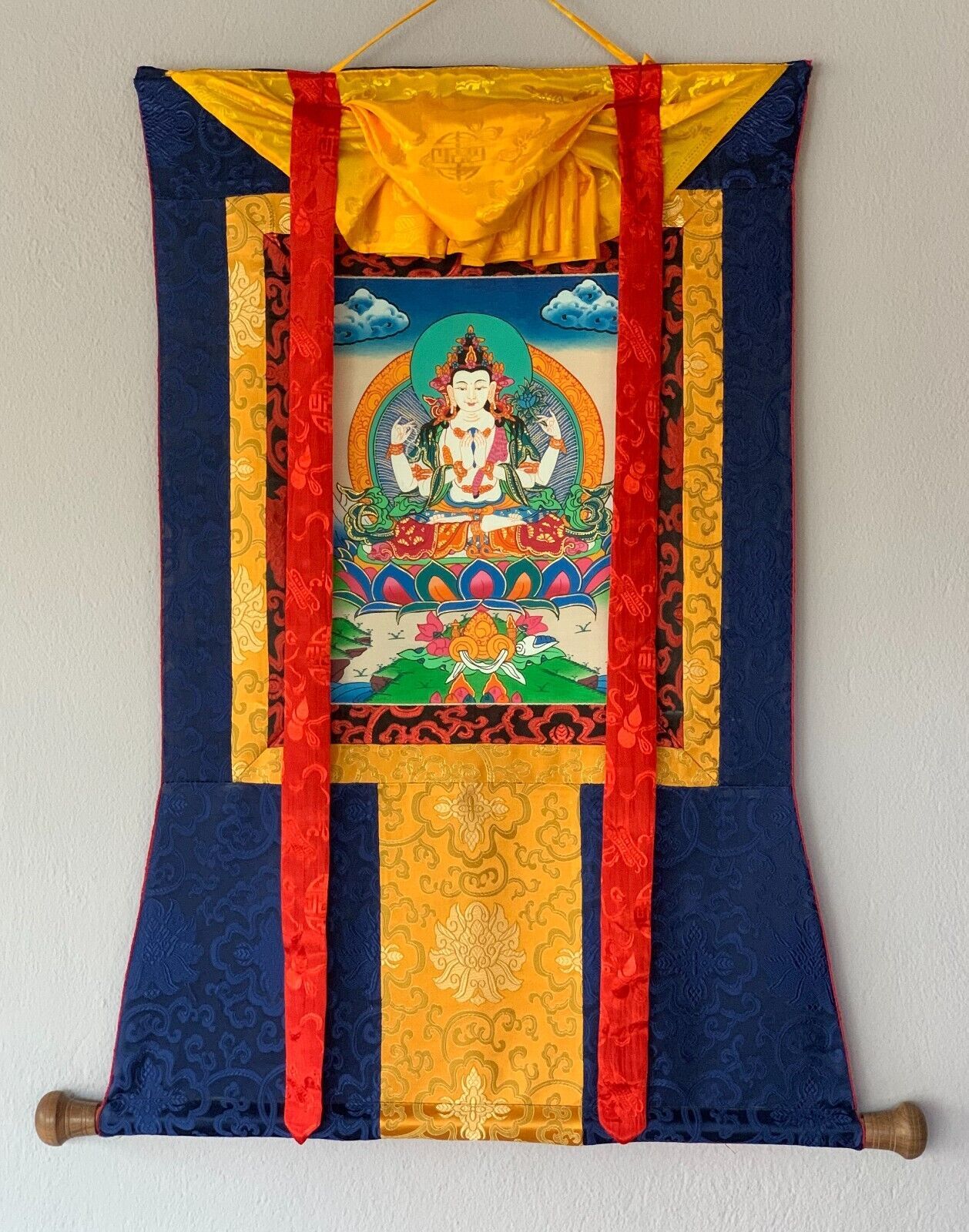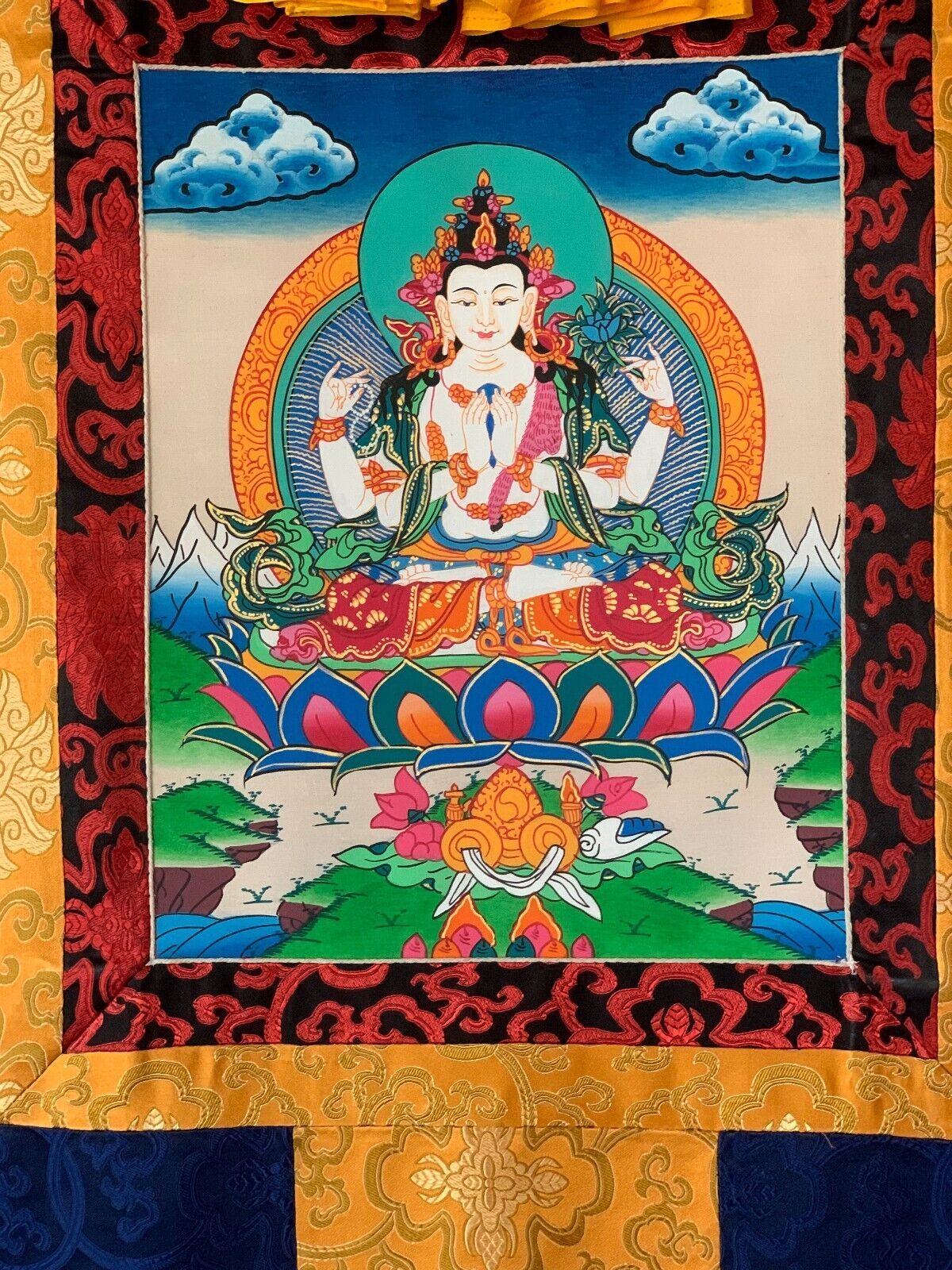 HAND-PAINTED AVALOKITESHVARA, CHENGRIZ, LOKESWOR,THANGKA WITH SILK BROCADE