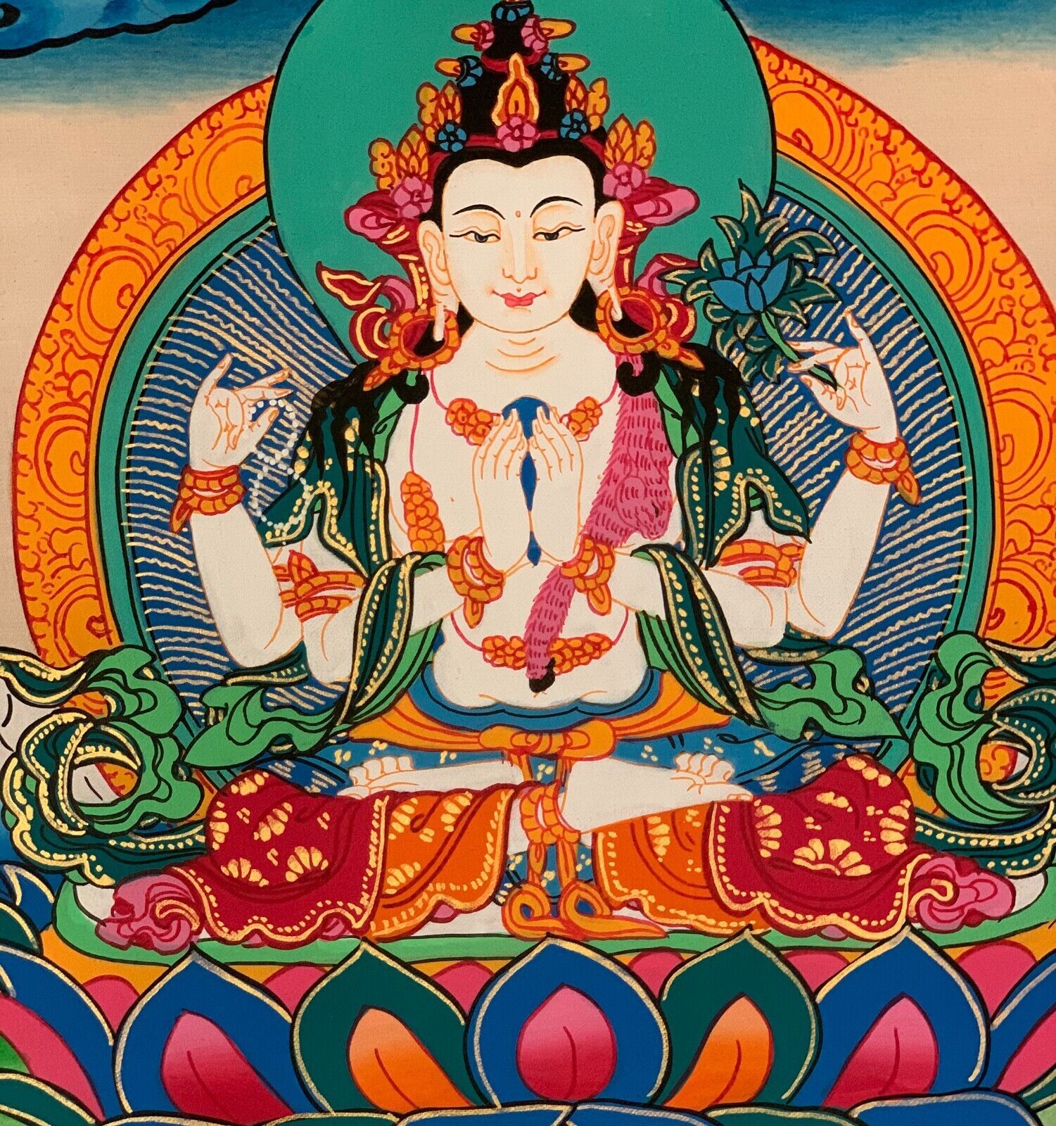 - HAND-PAINTED AVALOKITESHVARA, CHENGRIZ, LOKESWOR,THANGKA WITH SILK BROCADE