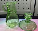 The product is a vintage Hazel-Atlas green depression glass syrup pitcher without a top. It stands at a height of 6 1/8 inches and is made of glass. This collectible jug features a classic design that adds a touch of nostalgia to any kitchen or home decor. Its unique color and brand make it a desirable piece for collectors of vintage dinnerware and serveware items. The candle holder has a small chip on the underside of the lip where the candle goes, not very noticeable. Both glow.