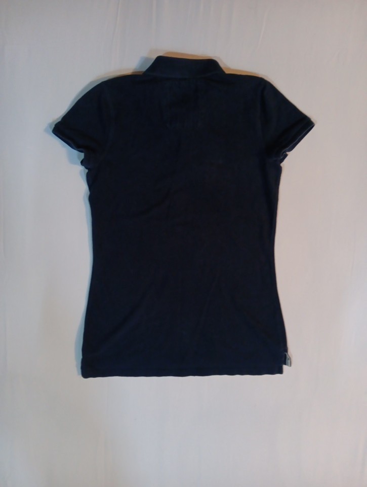 The Hollister Women's 3 Button Stretch Navy Blue Polo Shirt with the So Cali logo is a stylish and trendy top perfect for casual occasions. Made of comfortable cotton material, this slim-fit polo features a solid navy color with short cap sleeves and a collared neckline. The vintage-inspired design includes embroidered accents and button closures, adding a touch of flair to this classic polo shirt. Normal wear.