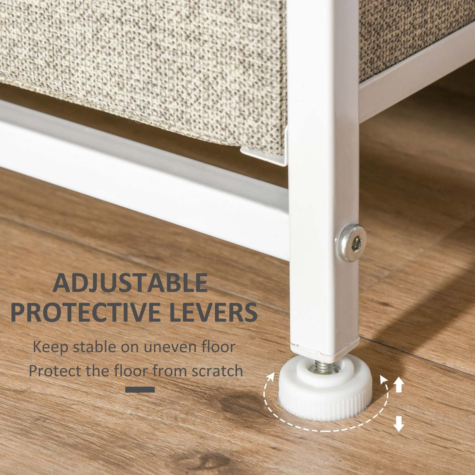 Stable with Floor Protection: Powder-coated metal frame for stability. A melamine-coated particleboard top can be used as a display shelf. The cube fabric drawers have feet with plastic caps at the bottom for slight height adjustment and floor protection.