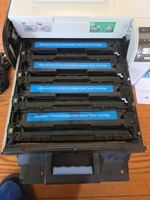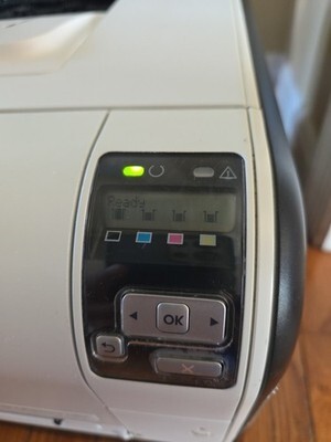 Great color Laserjet printer that does exactly what it should. This machine is wonderful. It comes with all toners mostly full. Looks great. It does have a go army sticker on it that I decided not to peel off and messing up the aesthetics. If you need a printer or network cable let me know and I will send one if I have one available. Will ship as soon as possible