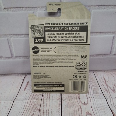 The product is a Hot Wheels 1978 Dodge Lil Red Express Truck in 1:64 scale diecast material. This limited edition pickup truck features the iconic red color and is part of the Hot Wheels Celebration Racers series. It comes sealed in an unopened box, making it a collectible item for boys and girls aged 3 and up. The model is a replica of the 1978 Dodge Lil Red Express Truck, celebrating the heritage of Mopar vehicles. Made in Malaysia, this Hot Wheels toy is a must-have for car enthusiasts and collectors alike.