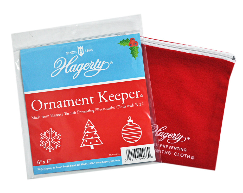 Made from Christmas Red Hagerty Silversmiths? Cloth with R-22 Tarnish Preventative, Hagerty Ornament Keepers prevent tarnish on sterling, silver plate, and gold ornaments from one Christmas to the next. Safe for use on any material, including glass and crystal.