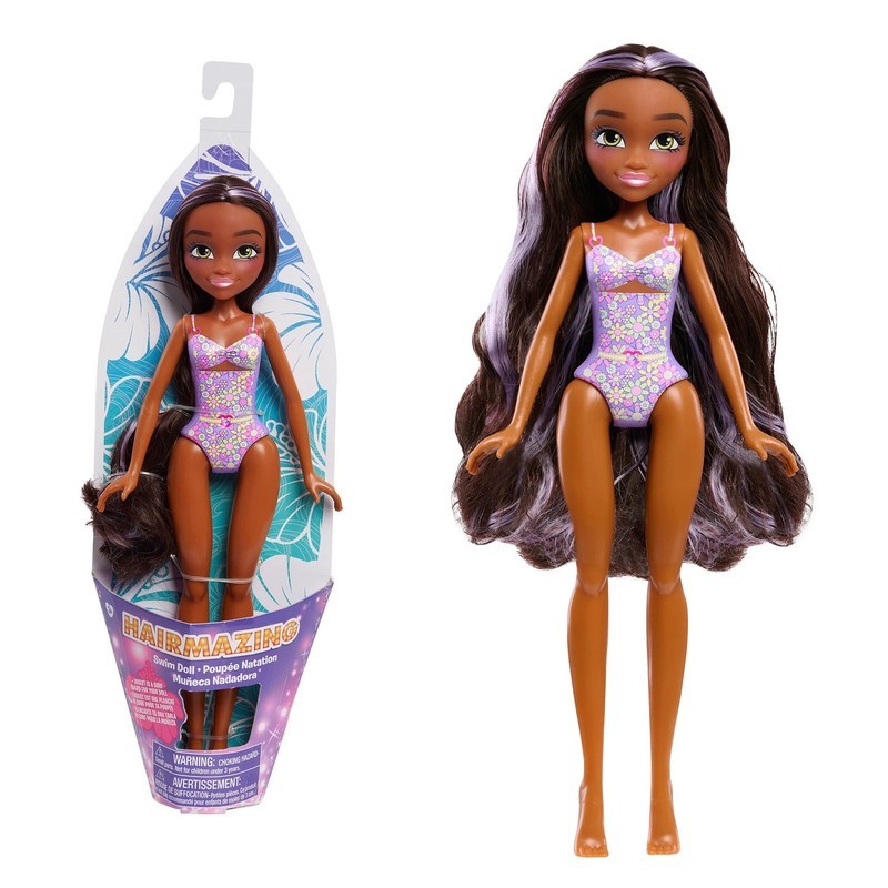 Bring extra glamour to the beach or pool with the Hairmazing Swim Doll, featuring a beautiful floral-print tank suit. This stunning, 11.75-inch fashion doll is ready for fun in the sun. She comes dressed in a unique molded purple 1-piece swimsuit with pink, yellow, green, and white flowers and heart embellishments. Her dark brown hair with purple streaks is styled in long waves, but can be restyled, braided, or twisted into a fancy updo. This gorgeous doll has 5 points of articulation for lots of great poses that help create imaginative stories and lots of beachy adventures. For even more fashionable fun, dress this adorable preschool toy doll in any outfit made for Hairmazing 11.75-inch Fashion Dolls (each sold separately). Dolls, accessories, and other Hairmazing kids? toys make wonderful birthday and anytime surprises for kids ages 3 years and up.