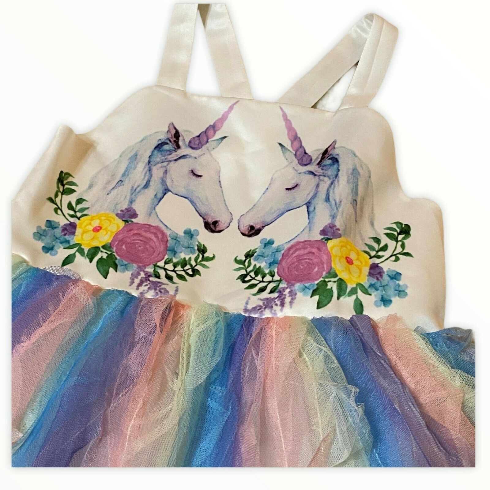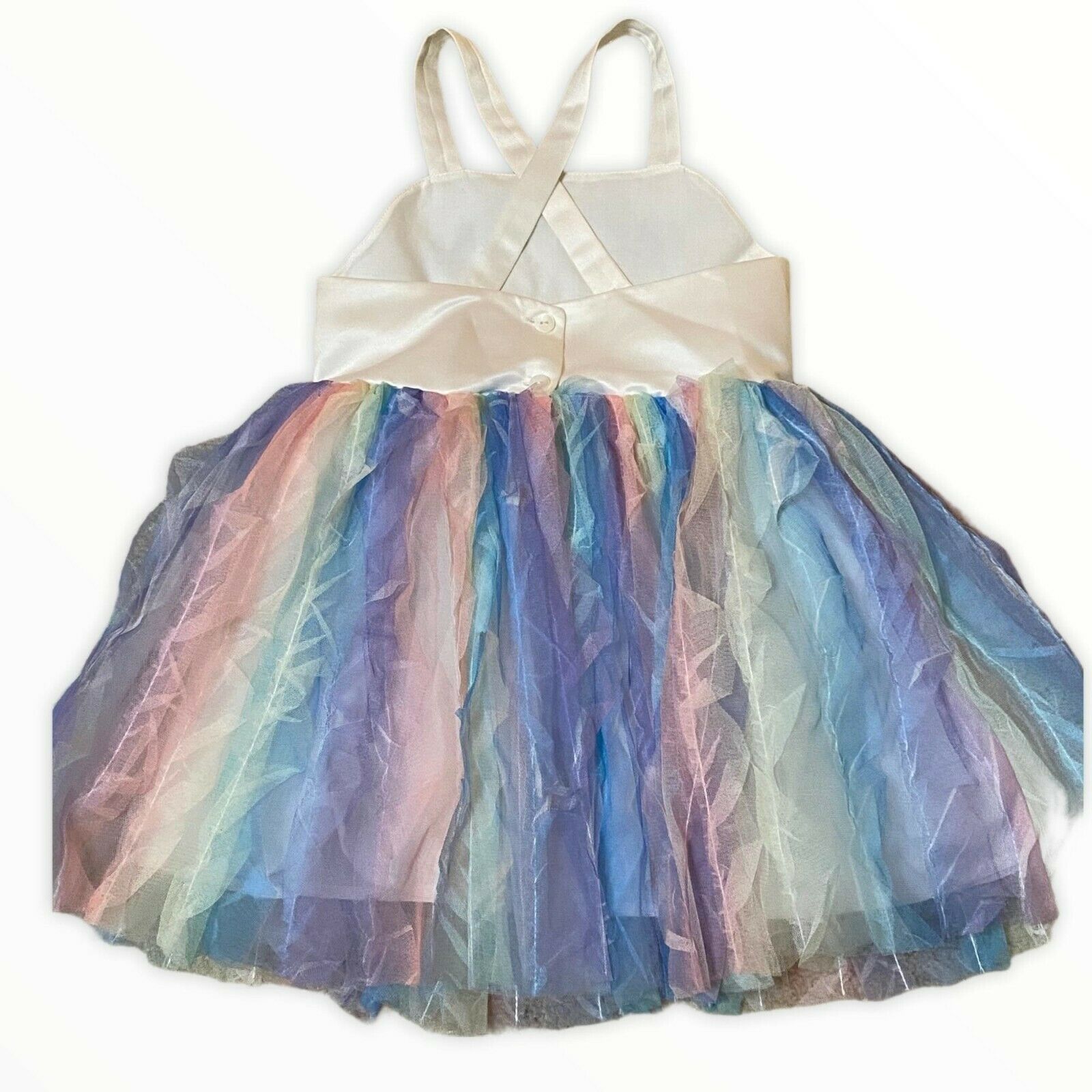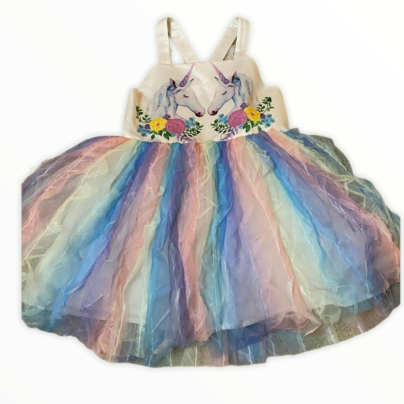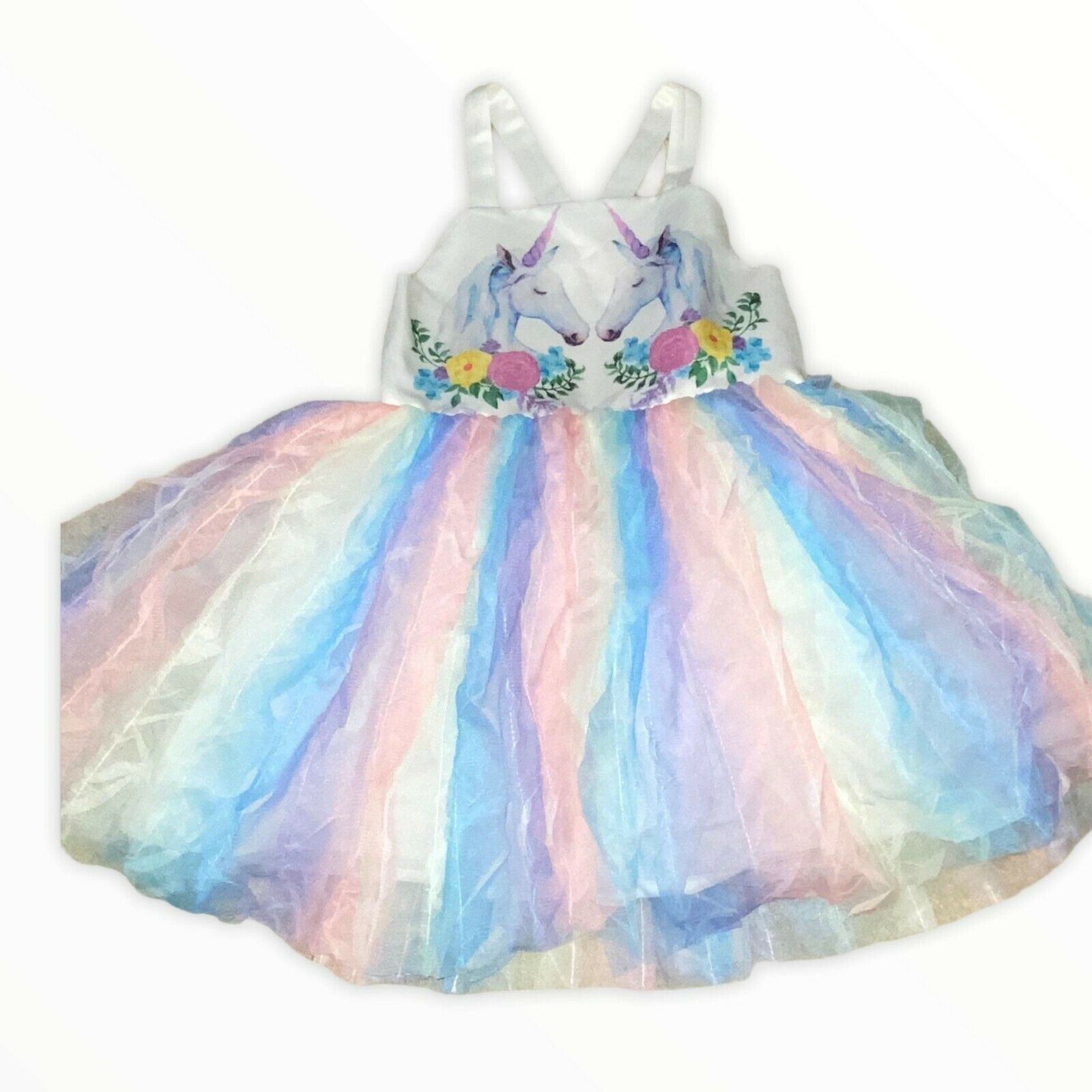 This girls dress is size 5, it has unicorns on the front and a rainbow skirt. Adjustable in criss-cross in the back so it can be worn really for up to size 6.