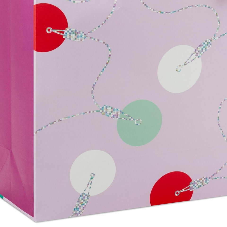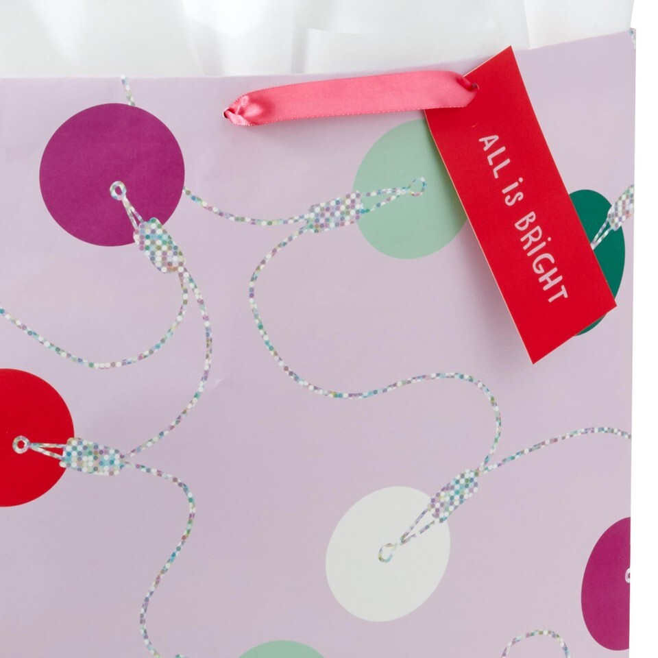 TRENDY DESIGN: Light pink gift bag features a shimmery string of round light bulbs in dark pink, red, mint green and white; includes pink ribbon handles and a gift tag that reads, "All Is Bright"